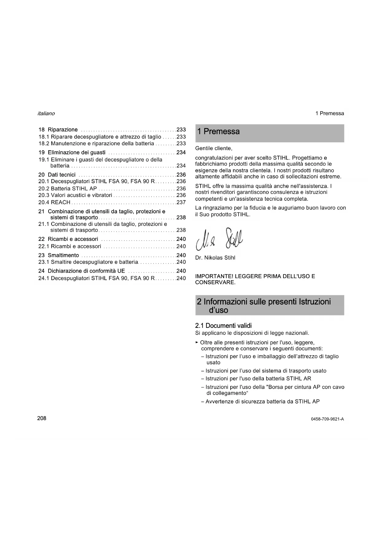 italiano 1 Premessa Gentile cliente, congratulazioni per aver scelto STIHL. Progettiamo e fabbrichiamo prodotti della massima qualità secondo le esigenze della nostra clientela. I nostri prodotti risultano altamente affidabili anche in caso di sollecitazioni estreme. STIHL offre la massima qualità anche nell'assistenza. I nostri rivenditori garantiscono consulenza e istruzioni competenti e un'assistenza tecnica completa. La ringraziamo per la fiducia e le auguriamo buon lavoro con il Suo prodotto STIHL. Dr. Nikolas Stihl