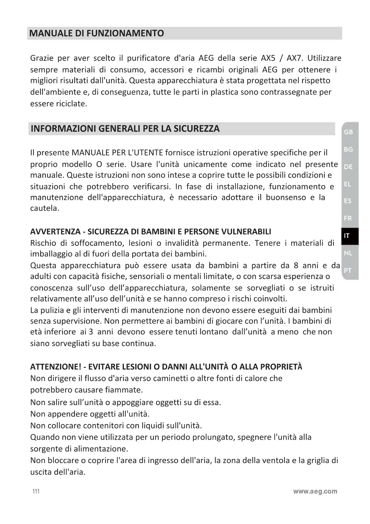 Grazie per aver scelto il purificatore d'aria AEG della serie AX5 / AX7. Utilizzare sempre materiali di consumo, accessori e ricambi originali AEG per ottenere i migliori risultati dall'unità. Questa apparecchiatura è stata progettata nel rispetto dell'ambiente e, di conseguenza, tutte le parti in plastica sono contrassegnate per essere riciclate.