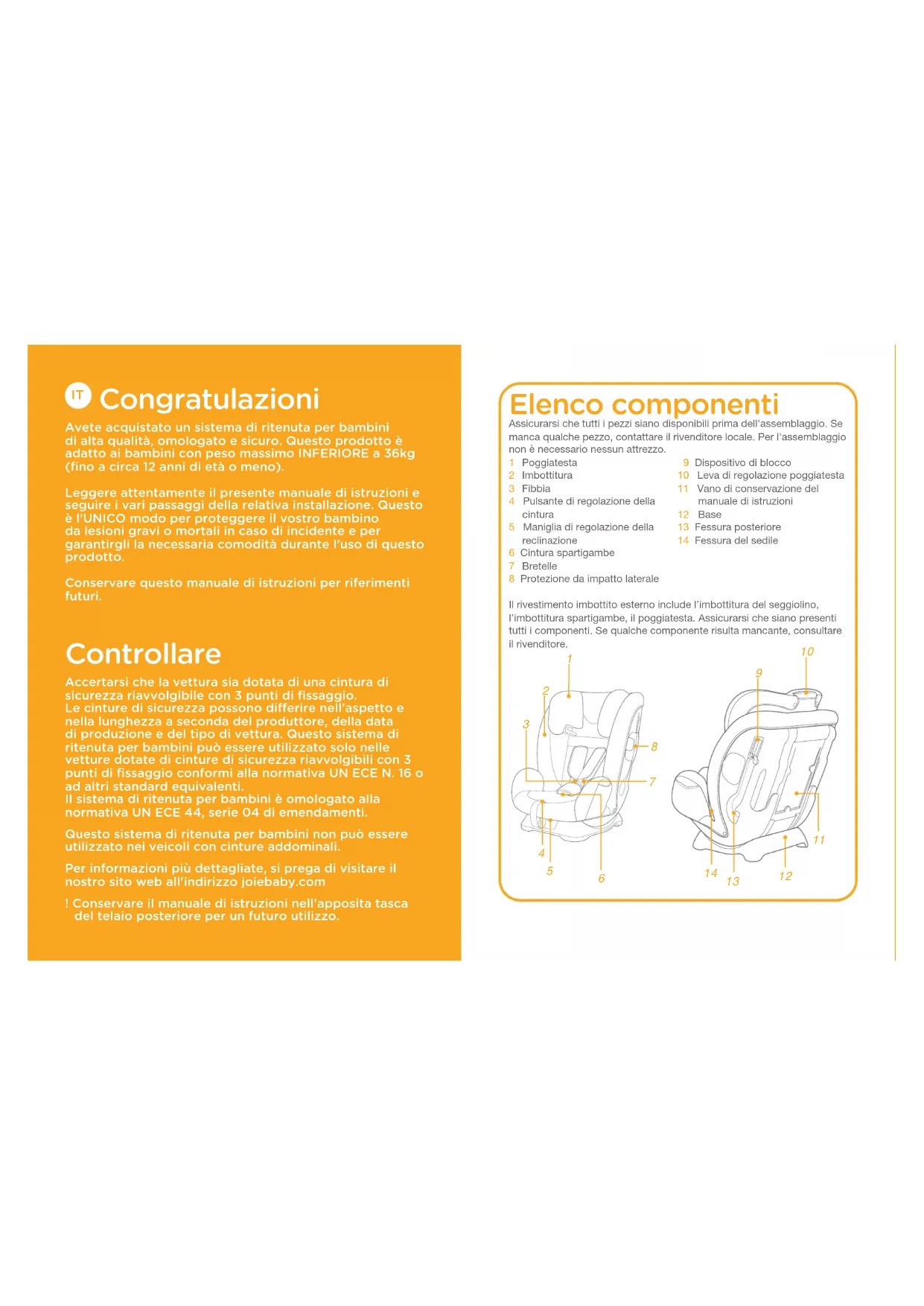 Congratulazioni Avete acquistato un sistema di ritenuta per bambini di alta qualità﹐ omologato e sicuro. Questo prodotto è adatto ai bambini con peso massimo INFERIORE a 36kg (fino a circa 12 anni di età o meno). Leggere attentamente il presente manuale di istruzioni e seguire i vari passaggi della relativa installazione. Questo è l’UNICO modo per proteggere il vostro bambino da lesioni gravi o mortali in caso di incidente e per garantirgli la necessaria comodità durante l’uso di questo prodotto. Conservare questo manuale di istruzioni per riferimenti futuri. Controllare Accertarsi che la vettura sia dotata di una cintura di sicurezza riavvolgibile con 3 punti di fissaggio. Le cinture di sicurezza possono differire nell’aspetto e nella lunghezza a seconda del produttore﹐ della data di produzione e del tipo di vettura. Questo sistema di ritenuta per bambini può essere utilizzato solo nelle vetture dotate di cinture di sicurezza riavvolgibili con 3 punti di fissaggio conformi alla normativa UN ECE N. 16 o ad altri standard equivalenti. Il sistema di ritenuta per bambini è omologato alla normativa UN ECE 44﹐ serie 04 di emendamenti. Questo sistema di ritenuta per bambini non può essere utilizzato nei veicoli con cinture addominali. Per informazioni più dettagliate﹐ si prega di visitare il nostro sito web all'indirizzo joiebaby.com ! Conservare il manuale di istruzioni nell’apposita tasca del telaio posteriore per un futuro utilizzo.