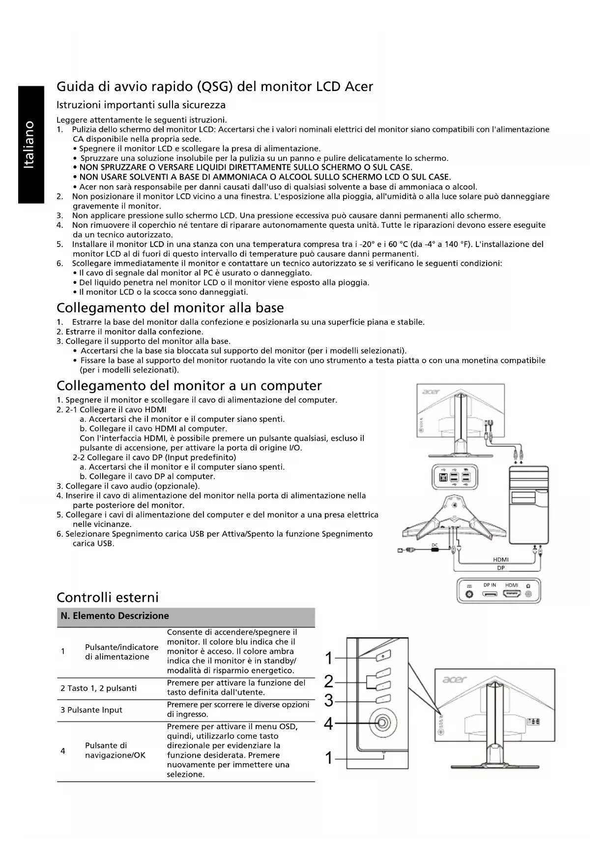 nVidia 3D Light Boost Transparence Mode Large Entrée Affectation raccourcis Md démarr rapide Modes Over Clock (DP uniquement) Informations sur l'écran Restaurer Quitter Les caractéristiques peuvent faire l'objet de modifications sans préavis.Italiano Guida di avvio rapido (QSG) del monitor LCD Acer Istruzioni importanti sulla sicurezza Leggere attentamente le seguenti istruzioni. 1. Pulizia dello schermo del monitor LCD: Accertarsi che i valori nominali elettrici del monitor siano compatibili con l'alimentazione CA disponibile nella propria sede.• Spegnere il monitor LCD e scollegare la presa di alimentazione.
