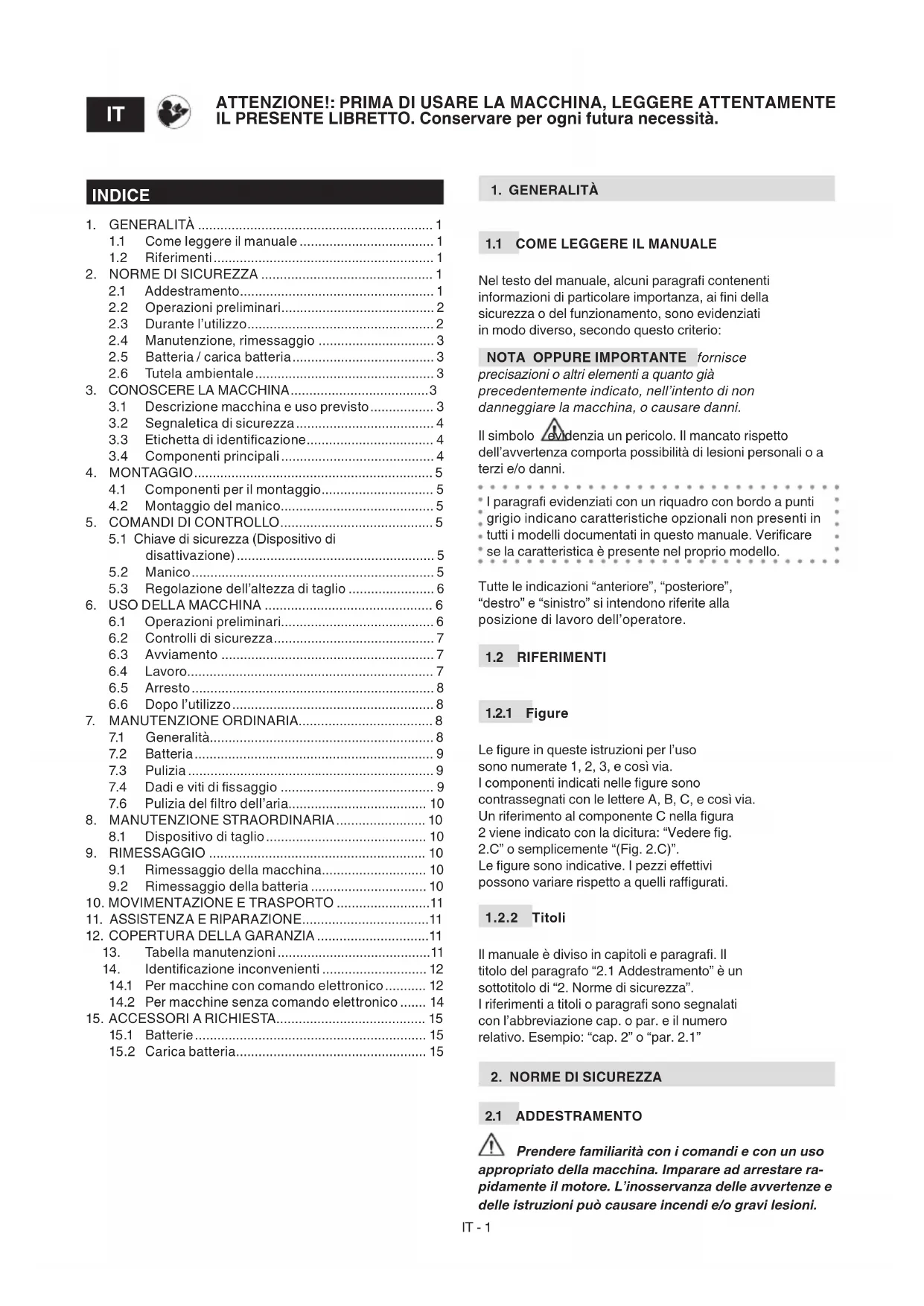 Prendere familiarità con i comandi e con un uso appropriato della macchina. Imparare ad arrestare ra- pidamente il motore. L’inosservanza delle avvertenze e delle istruzioni può causare incendi e/o gravi lesioni. ATTENZIONE!: PRIMA DI USARE LA MACCHINA, LEGGERE ATTENTAMENTE IL PRESENTE LIBRETTO. Conservare per ogni futura necessità.