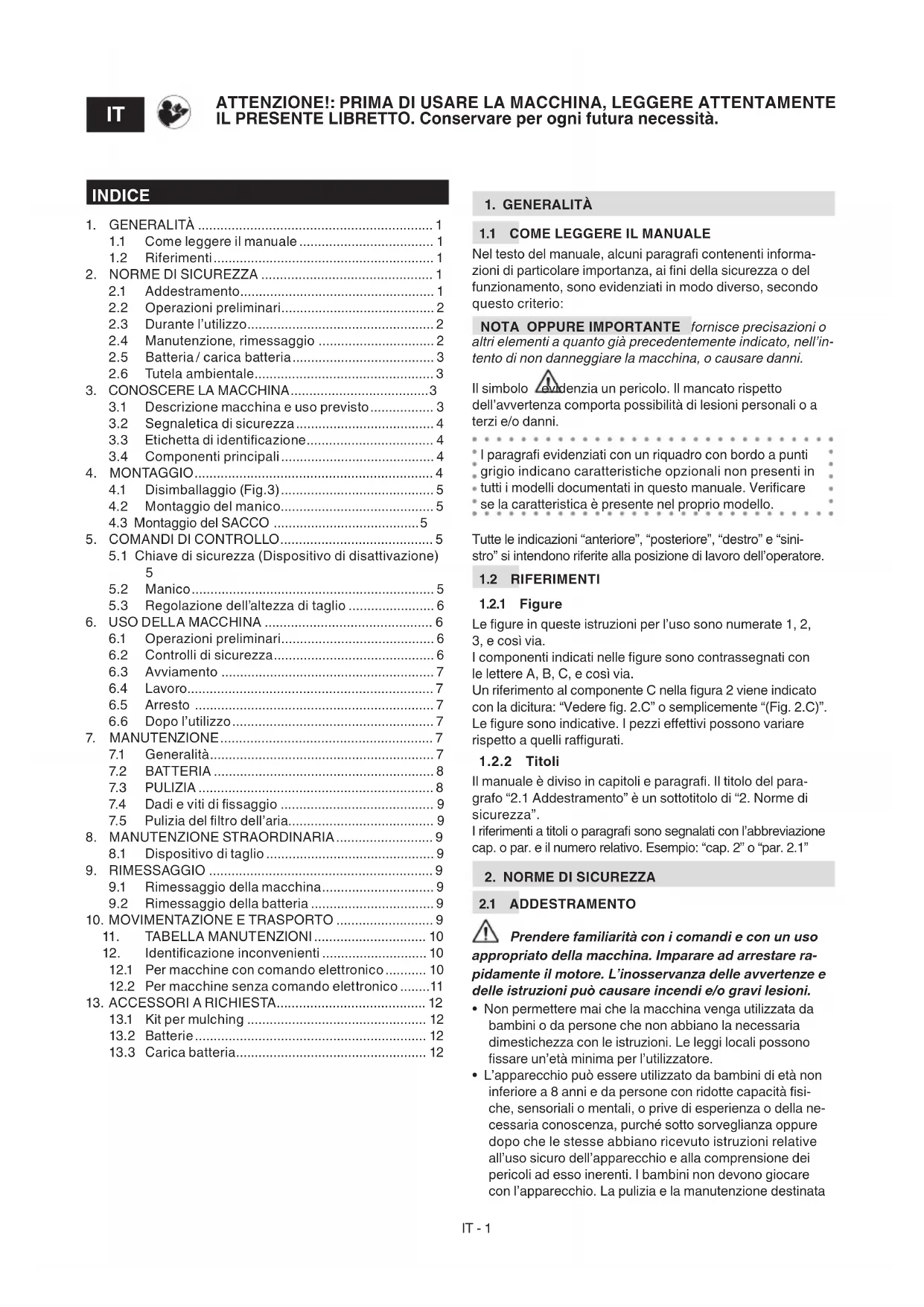IMPORTANTE Le seguenti norme di sicurezza integrano le prescrizioni di sicurezza presenti nello specico libretto della batteria e del carica batteria allegato alla macchina.