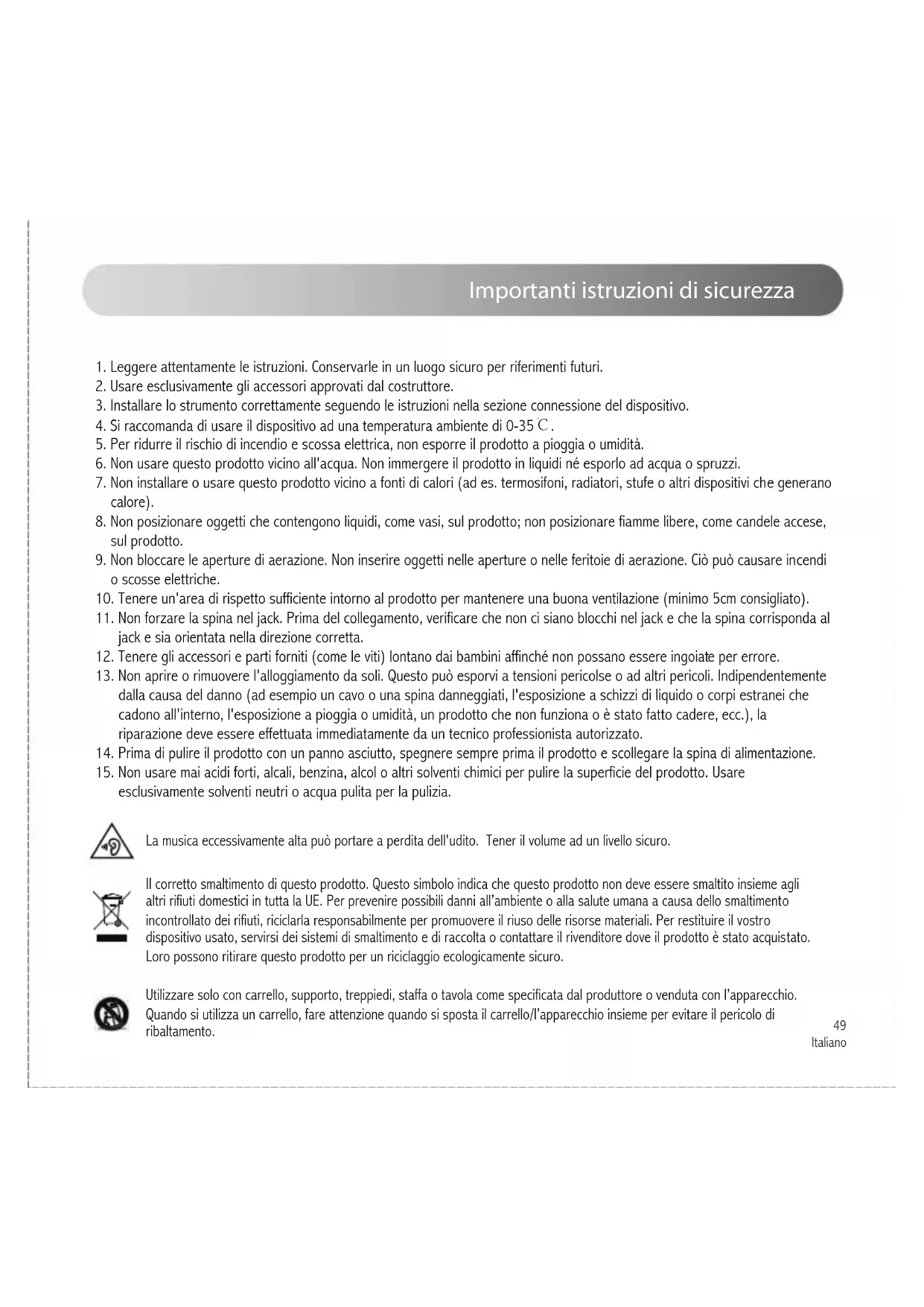 e per errore. 13. Non aprire o rimuovere l'alloggiamento da soli. Questo può esporvi a tensioni pericolse o ad altri pericoli. Indipendentemente dalla causa del danno (ad esempio un cavo o una spina danneggiati, l'esposizione a schizzi di liquido o corpi estranei che cadono all'interno, l'esposizione a pioggia o umidità, un prodotto che non funziona o è stato fatto cadere, ecc.), la riparazione deve essere effettuata immediatamente da un tecnico professionista autorizzato. 14. Prima di pulire il prodotto con un panno asciutto, spegnere sempre prima il prodotto e scollegare la spina di alimentazione. 15. Non usare mai acidi forti, alcali, benzina, alcol o altri solventi chimici per pulire la superficie del prodotto. Usare esclusivamente solventi neutri o acqua pulita per la pulizia.50 Italiano Importanti istruzioni di sicurezza Questo simbolo avverte l'utente della presenza di tensioni pericolose non isolate all'interno dell'involucro del prodotto che potrebbero essere di grandezza sufficiente da costituire un pericolo di scosse elettriche per le persone. Questo simbolo avverte l'utente di non smontare l'involucro del prodotto e che non vi sono parti sostituibili dall'utente all'interno. Portare il prodotto presso un centro di assistenza autorizzato per la riparazione. Questo simbolo indica che il prodotto è destinato esclusivamente all'uso in ambienti interni. Avvertenza sull'alimentazione: