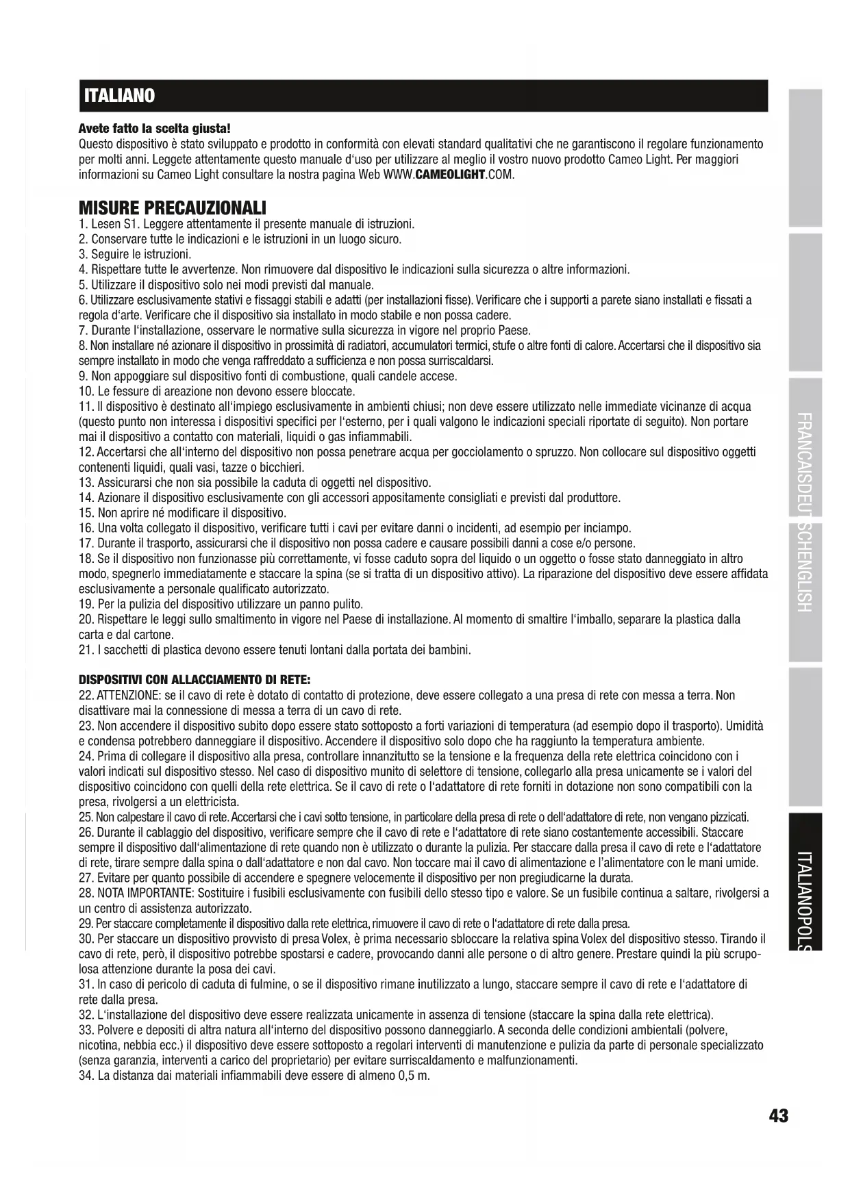 ITALIANO Avete fatto la scelta giusta! Questo dispositivo è stato sviluppato e prodotto in conformità con elevati standard qualitativi che ne garantiscono il regolare funzionamento per molti anni. Leggete attentamente questo manuale d‘uso per utilizzare al meglio il vostro nuovo prodotto Cameo Light. Per maggiori informazioni su Cameo Light consultare la nostra pagina Web WWW.CAMEOLIGHT.COM. MISURE PRECAUZIONALI