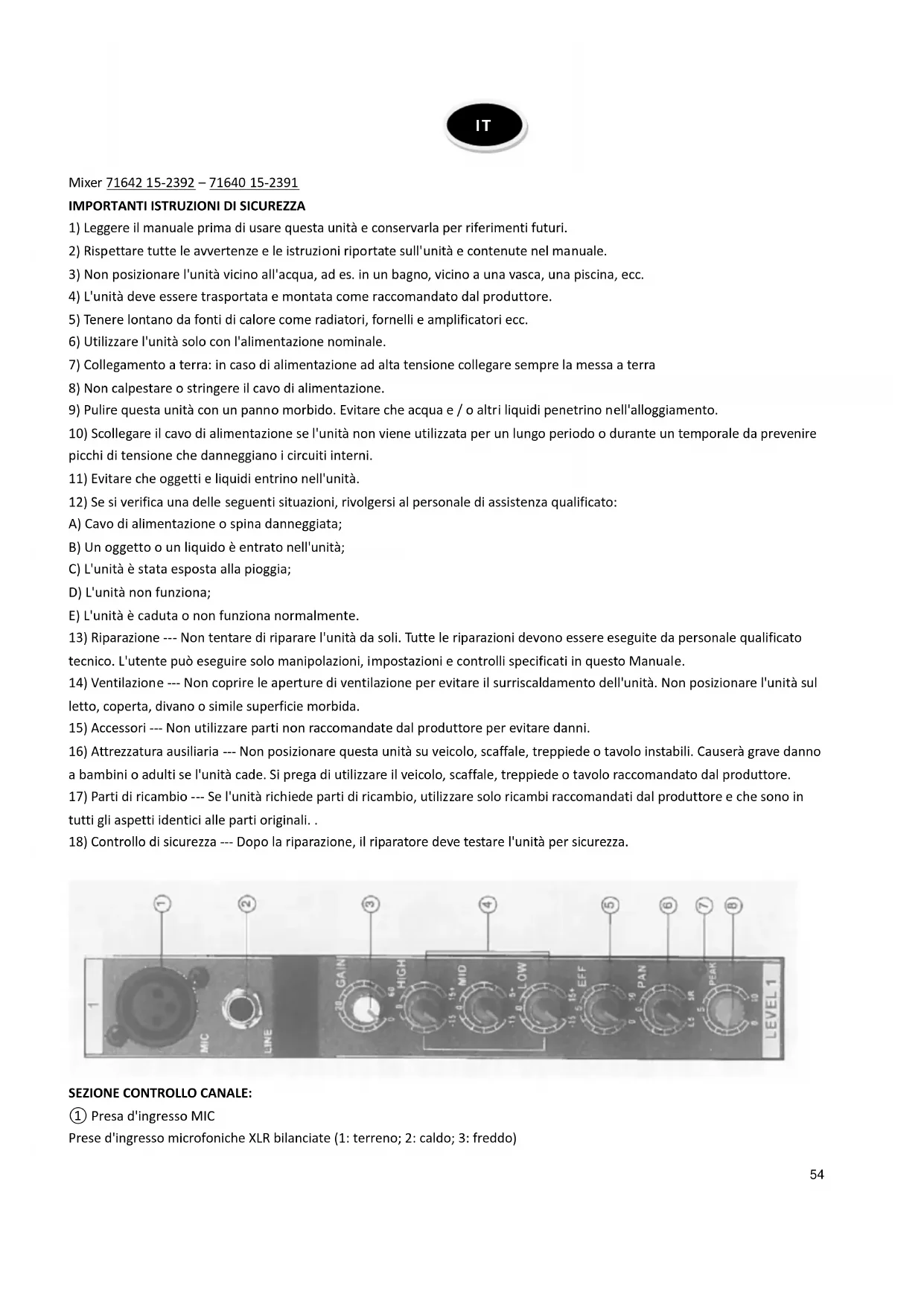 SEZIONE CONTROLLO CANALE: ① Presa d'ingresso MIC Prese d'ingresso microfoniche XLR bilanciate (1: terreno; 2: caldo; 3: freddo) IT55 ② Prese di ingresso LINE Prese TRS bilanciate (T: caldo; R: freddo; S: Terra) È possibile collegare prese jack bilanciate o sbilanciate a questa presa. ③ Controllo GAIN Regolazione del livello del segnale di ingresso. Per ottenere il miglior equilibrio tra il Rapporto S / N e la gamma dinamica, regolare il livello del segnale di ingresso in modo che il L'indicatore PEAK si accende occasionalmente e brevemente solo al picco. ④ Equalizzatore (ALTO, MEDIO e BASSO) Questo EQ a 3 bande regola le bande di alta, media e bassa frequenza del canale. Il canale stereo ha una banda a 2 frequenze: ALTA e BASSA. Impostando la manopola su la posizione "▼" produce una risposta in frequenza piatta nella banda corrispondente. Ruotando la manopola verso destra si aumenta la corrispondente banda di frequenza, mentre si gira a sinistra attenua la banda. La seguente tabella mostra il Tipo EQ, frequenza e taglio / aumento massimo per ciascuna delle tre bande. ⑤ Controllo EFFETTO Regola il livello del segnale inviato dal canale al bus EFFECT. Nota che anche il livello del segnale inviato al bus è influenzato dal fader del canale. ⑥ Controllo PAN Il controllo PAN determina il posizionamento stereo del segnale del canale attivo gli autobus STEREO L & R. ⑦ Indicatore PEAK Il livello di picco del segnale post-EQ viene rilevato e l'indicatore PEAK si illumina in giallo quando il livello raggiunge 3dB sotto il clipping. ⑧ Channel Fader Control Regola il livello del segnale del canale. Usa questi fader per regolare l'equilibrio tra i vari canali. NOTA: impostare i fader dei canali non utilizzati fino in fondo per ridurre al minimo il disturbo.