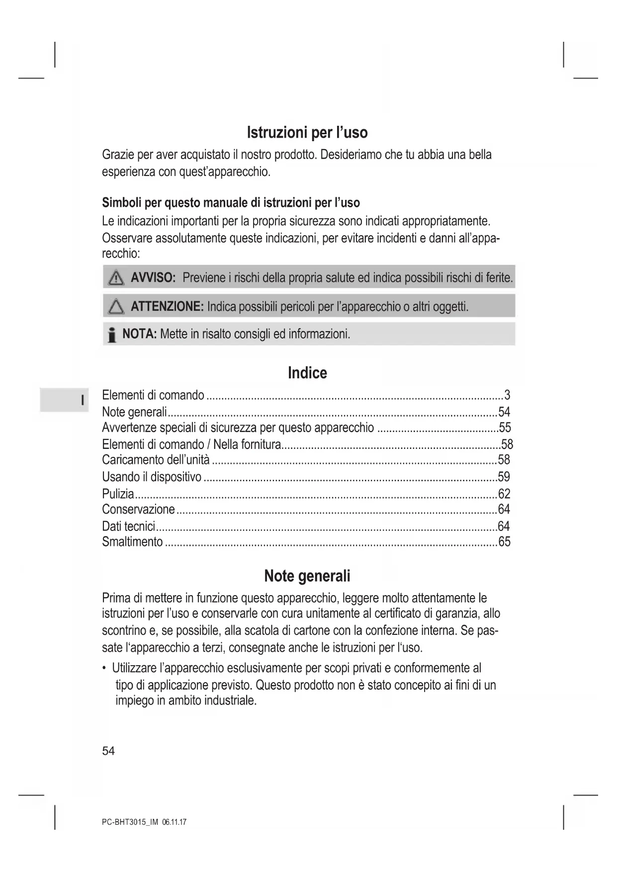 - Utilizzare l’apparecchio esclusivamente per scopi privati e conformemente al tipo di applicazione previsto. Questo prodotto non è stato concepito ai fini di un impiego in ambito industriale.PC-BHT3015_IM 06.11.17