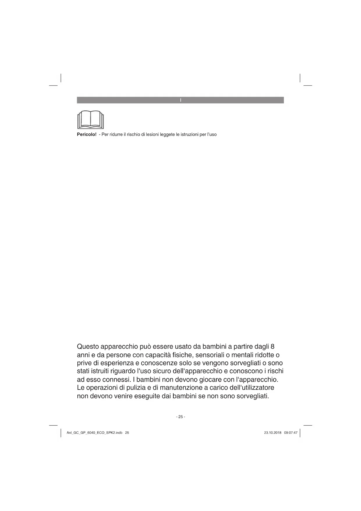 Pericolo! - Per ridurre il rischio di lesioni leggete le istruzioni per l’uso Questo apparecchio può essere usato da bambini a partire dagli 8 anni e da persone con capacità fi siche, sensoriali o mentali ridotte o prive di esperienza e conoscenze solo se vengono sorvegliati o sono stati istruiti riguardo l‘uso sicuro dell‘apparecchio e conoscono i rischi ad esso connessi. I bambini non devono giocare con l‘apparecchio. Le operazioni di pulizia e di manutenzione a carico dell‘utilizzatore non devono venire eseguite dai bambini se non sono sorvegliati. Anl_GC_GP_6040_ECO_SPK2.indb 25Anl_GC_GP_6040_ECO_SPK2.indb 25 23.10.2018 09:07:4723.10.2018 09:07:47I
