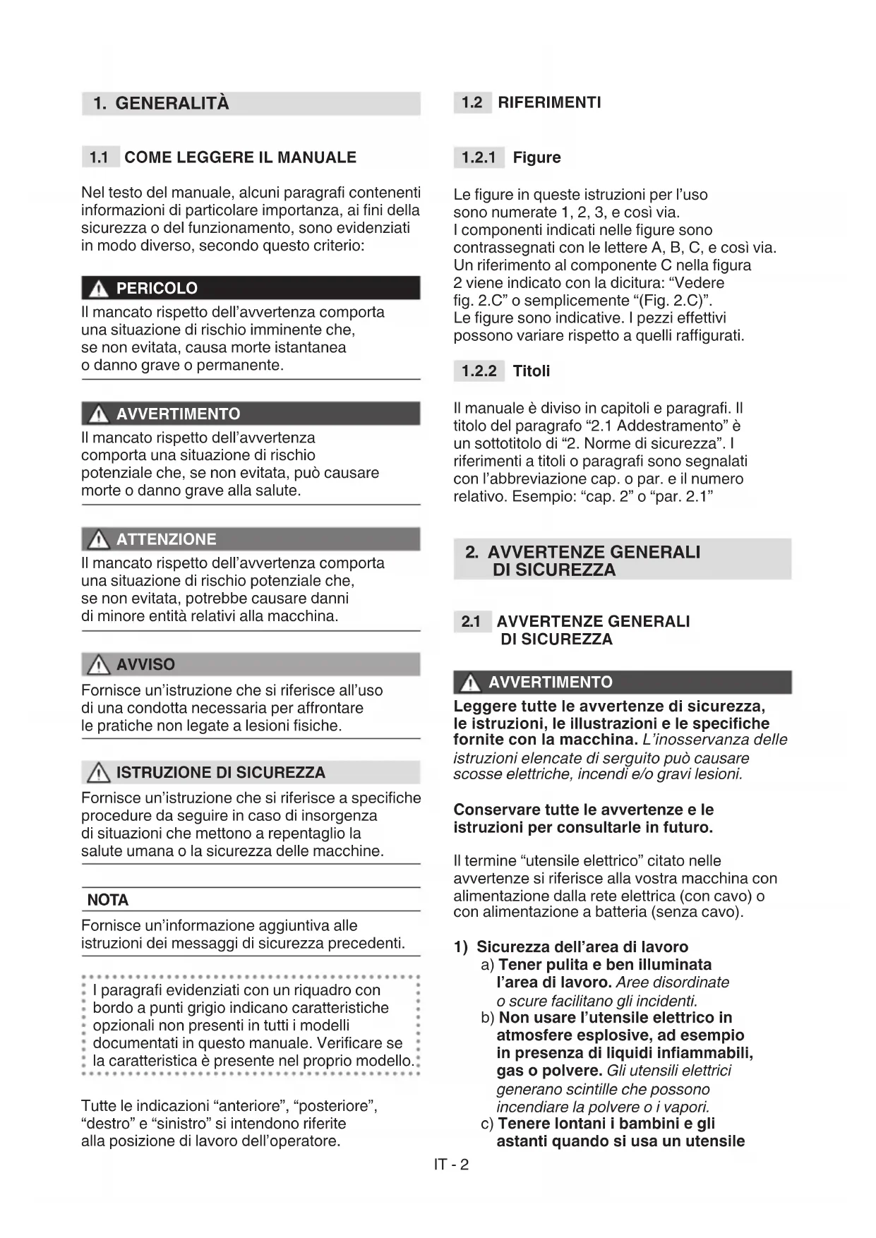 a) Tener pulita e ben illuminata l’area di lavoro. Aree disordinate o scure facilitano gli incidenti. b) Non usare l’utensile elettrico in atmosfere esplosive, ad esempio in presenza di liquidi inammabili, gas o polvere. Gli utensili elettrici generano scintille che possono incendiare la polvere o i vapori. c) Tenere lontani i bambini e gli astanti quando si usa un utensileIT - 3 elettrico. Le distrazioni possono causare la perdita di controllo.
