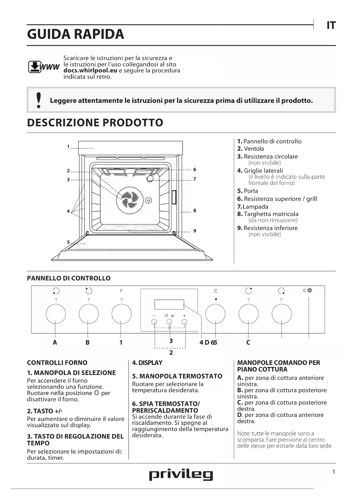 PIANO COTTURA A. per zona di cottura anterioresinistra.B. per zona di cottura posterioresinistra.C. per zona di cottura posterioredestra.D. per zona di cottura anterioredestra.Note: tutte le manopole sono a scomparsa. Fare pressione al centro delle stesse per estrarle dalla loro sede. GUIDA RAPIDA Leggere attentamente le istruzioni per la sicurezza prima di utilizzare il prodotto. WWW Scaricare le istruzioni per la sicurezza e le istruzioni per l’uso collegandosi al sito docs.whirlpool.eu e seguire la procedura indicata sul retro.