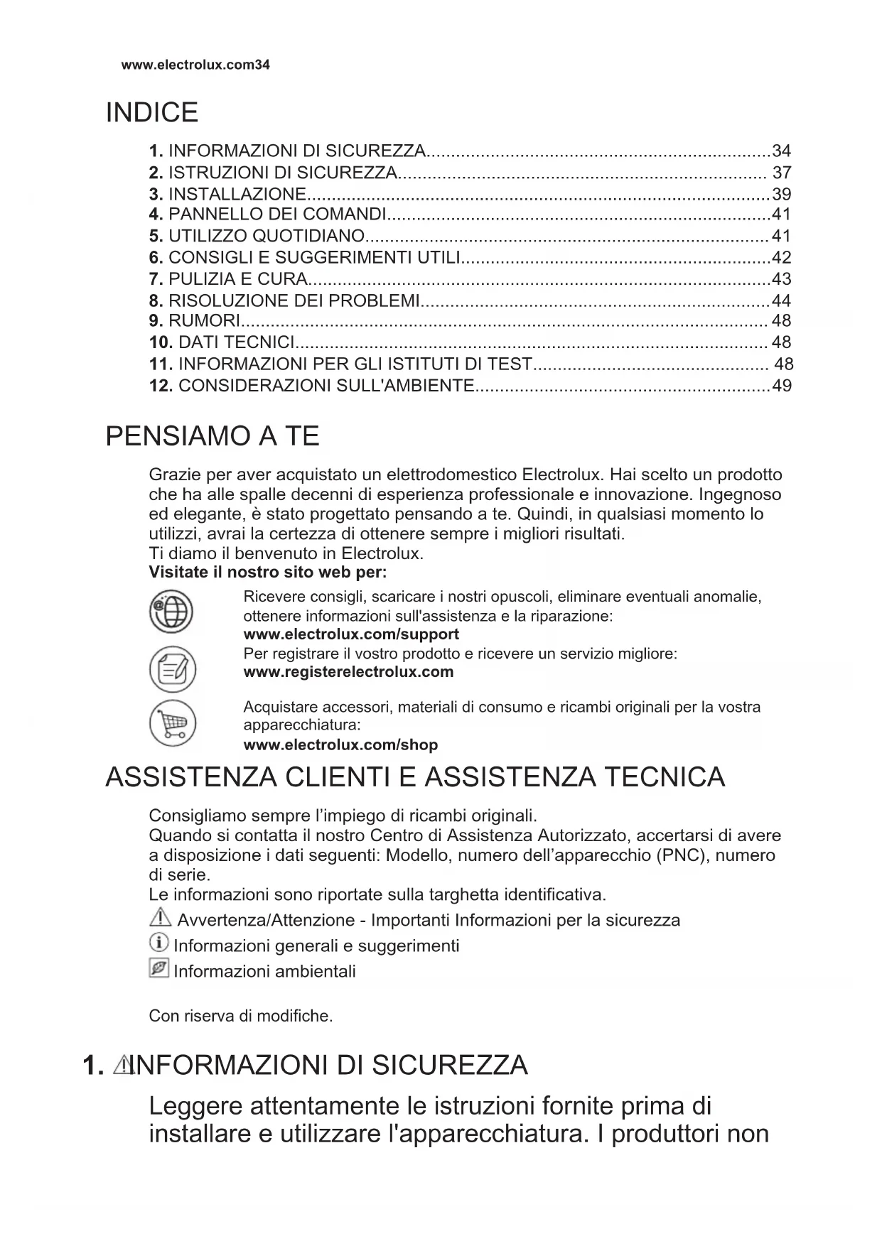 Leggere attentamente le istruzioni fornite prima di installare e utilizzare l'apparecchiatura. I produttori non www.electrolux.com34sono responsabili di eventuali lesioni o danni derivanti da un'installazione o un uso scorretti. Conservare sempre le istruzioni in un luogo sicuro e accessibile per poterle consultare in futuro.