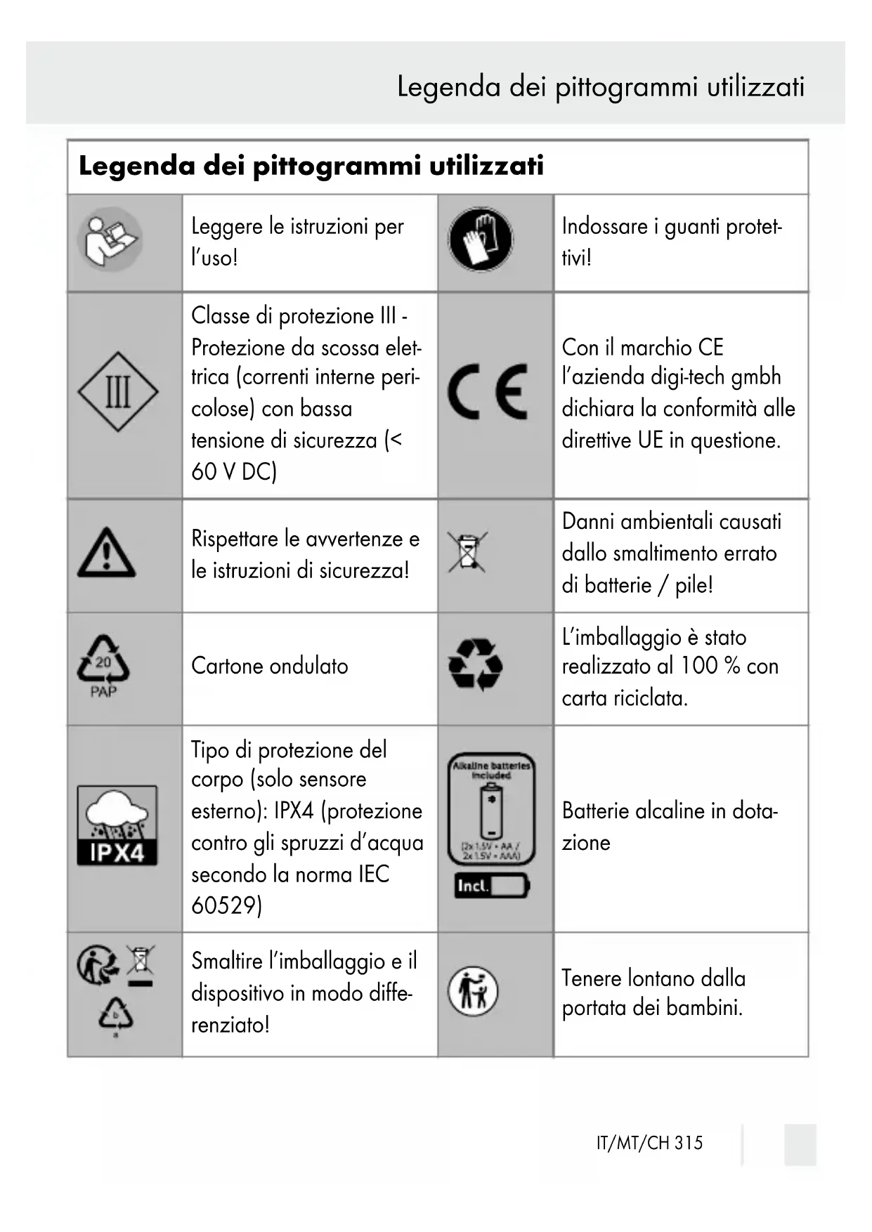 Sommario 314 IT/MT/CHLegenda dei pittogrammi utilizzati Leggere le istruzioni per l’uso! Indossare i guanti protet tivi! Classe di protezione III - Protezione da scossa elet trica (correnti interne peri colose) con bassa tensione di sicurezza (< 60 V DC) Con il marchio CE l’azienda digi-tech gmbh dichiara la conformità alle direttive UE in questione. Rispettare le avvertenze e le istruzioni di sicurezza! Einleitung / Sicherheit Danni ambientali causati dallo smaltimento errato di batterie / pile! Cartone ondulato L’imballaggio è stato realizzato al 100 % con carta riciclata. Tipo di protezione del corpo (solo sensore esterno): IPX4 (protezione contro gli spruzzi d’acqua secondo la norma IEC 60529) Batterie alcaline in dota zione Smaltire l’imballaggio e il dispositivo in modo diffe- renziato! Tenere lontano dalla portata dei bambini. IT/MT/CH 315 Legenda dei pittogrammi utilizzatiNon gettare nel fuoco! Fare attenzione a non invertire la polarità (+ /