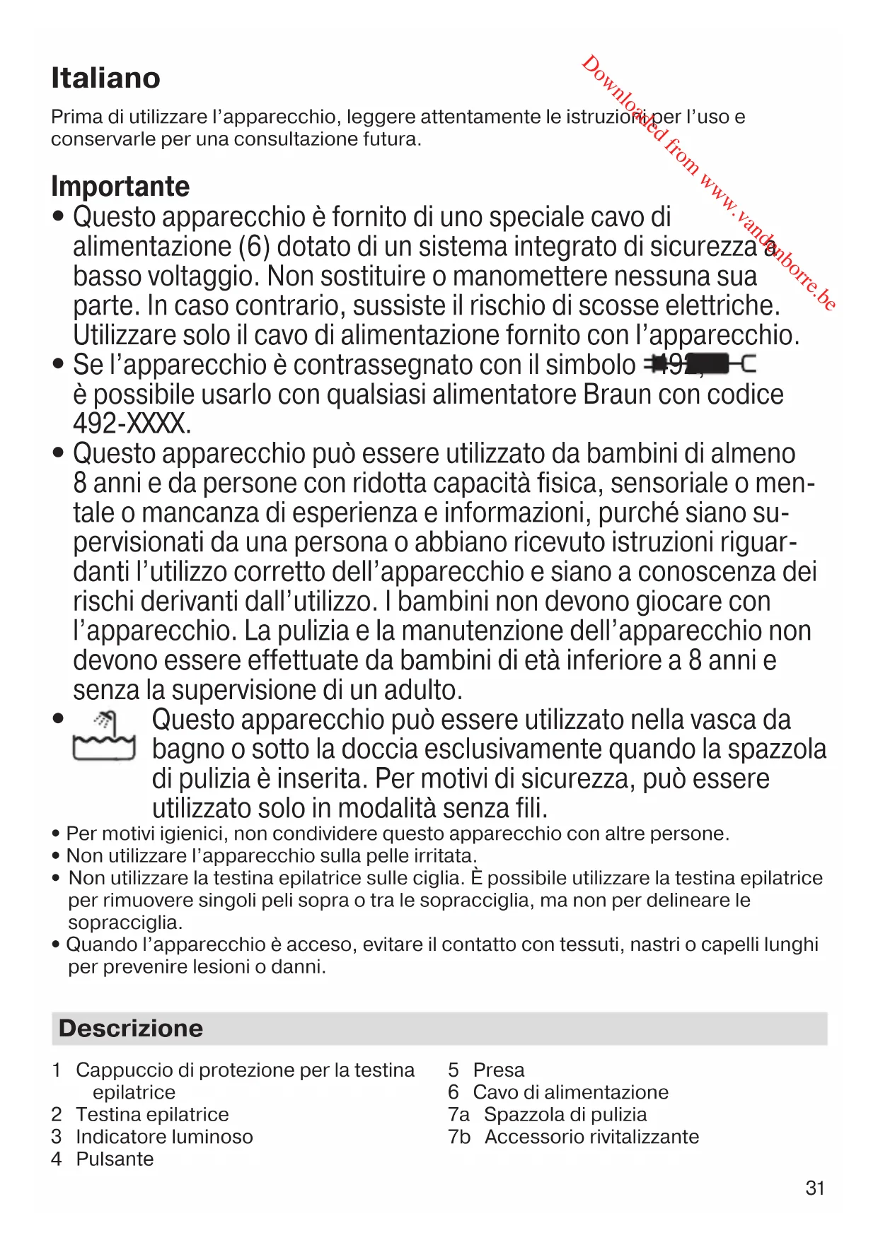 Questo apparecchio è fornito di uno speciale cavo di alimentazione (6) dotato di un sistema integrato di sicurezza a basso voltaggio. Non sostituire o manomettere nessuna sua parte. In caso contrario, sussiste il rischio di scosse elettriche. Utilizzare solo il cavo di alimentazione fornito con l’apparecchio.