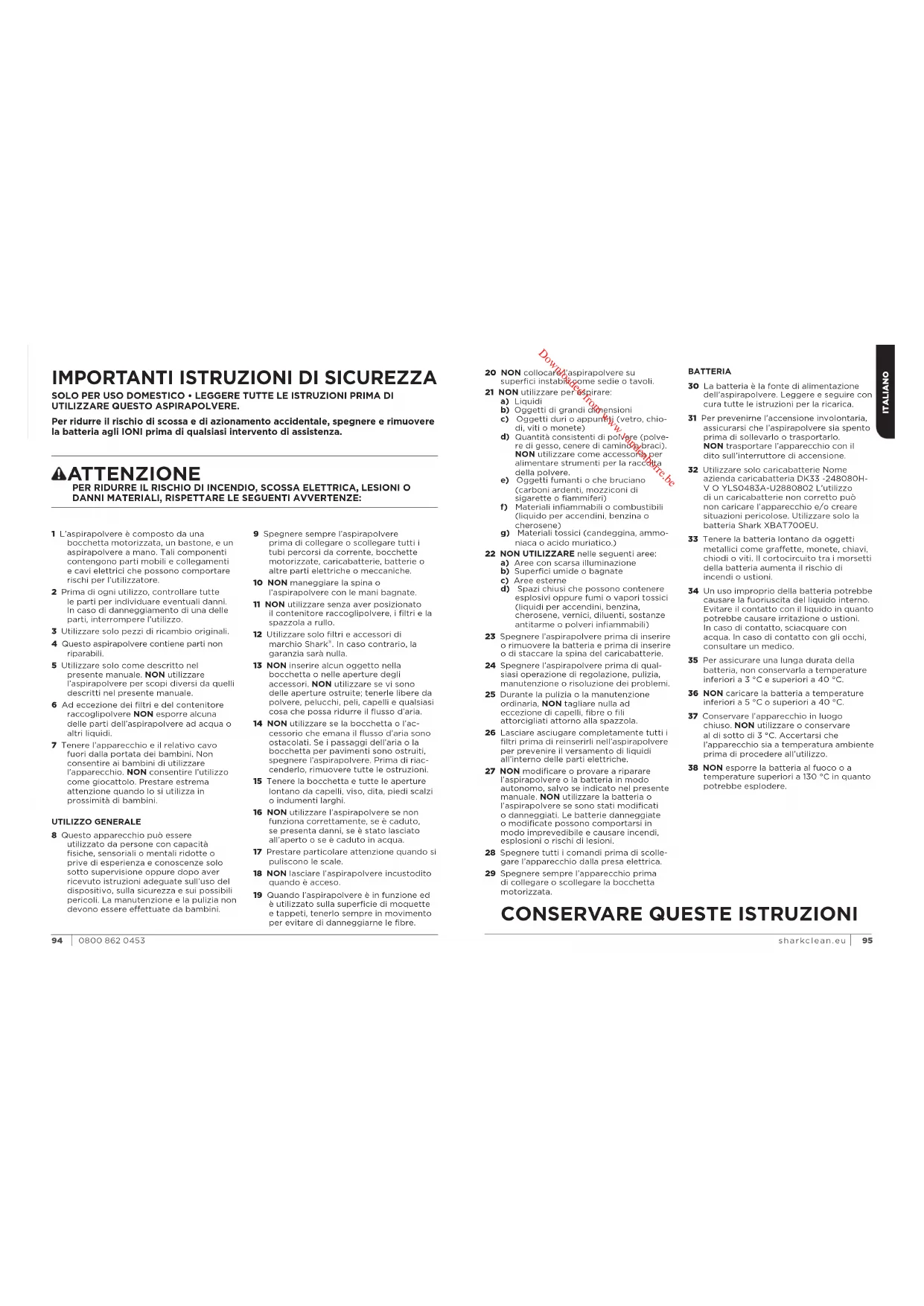 - Garanzia Della Batteria ITALIANO 92 930800 862 0453 sharkclean.eu SOMMARIO GRAZIE per avere acquistato l’aspirapolvere senza fili Shark con tecnologia DuoClean e sistema anti-grovigli Downloaded from www.vandenborre.be1 L’aspirapolvere è composto da una bocchetta motorizzata, un bastone, e un aspirapolvere a mano. Tali componenti contengono parti mobili e collegamenti e cavi elettrici che possono comportare rischi per l’utilizzatore. 2 Prima di ogni utilizzo, controllare tutte le parti per individuare eventuali danni. In caso di danneggiamento di una delle parti, interrompere l’utilizzo. 3 Utilizzare solo pezzi di ricambio originali. 4 Questo aspirapolvere contiene parti non riparabili. 5 Utilizzare solo come descritto nel presente manuale. NON utilizzare l’aspirapolvere per scopi diversi da quelli descritti nel presente manuale. 6 Ad eccezione dei filtri e del contenitore raccoglipolvere NON esporre alcuna delleparti dell’aspirapolvere ad acqua o altri liquidi. 7 Tenere l’apparecchio e il relativo cavo fuori dalla portata dei bambini. Non consentire ai bambini di utilizzare l'apparecchio. NON consentire l’utilizzo come giocattolo. Prestare estrema attenzione quando lo si utilizza in prossimità di bambini. UTILIZZO GENERALE 8 Questo apparecchio può essere utilizzato da persone con capacità fisiche, sensoriali o mentali ridotte o prive di esperienza e conoscenze solo sotto supervisione oppure dopo aver ricevuto istruzioni adeguate sull’uso del dispositivo, sulla sicurezza e sui possibili pericoli. La manutenzione e la pulizia non devono essere eettuate da bambini. 9 Spegnere sempre l’aspirapolvere prima di collegare o scollegare tutti i tubi percorsi da corrente, bocchette motorizzate, caricabatterie, batterie o altre parti elettriche o meccaniche. 10 NON maneggiare la spina o l’aspirapolvere con le mani bagnate. 11 NON utilizzare senza aver posizionato il contenitore raccoglipolvere, i filtri e la spazzola a rullo. 12 Utilizzare solo filtri e accessori di marchioShark p. 109