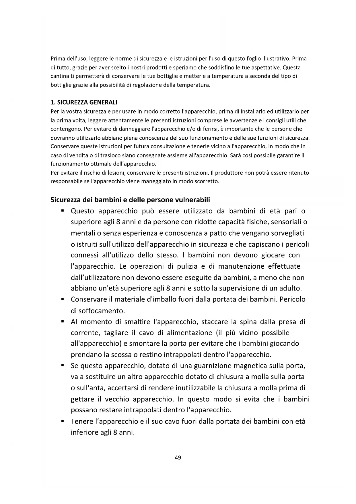 Per la vostra sicurezza e per usare in modo corretto l'apparecchio, prima di installarlo ed utilizzarlo per la prima volta, leggere attentamente le presenti istruzioni comprese le avvertenze e i consigli utili che contengono. Per evitare di danneggiare l'apparecchio e/o di ferirsi, è importante che le persone che dovranno utilizzarlo abbiano piena conoscenza del suo funzionamento e delle sue funzioni di sicurezza. Conservare queste istruzioni per futura consultazione e tenerle vicino all'apparecchio, in modo che in caso di vendita o di trasloco siano consegnate assieme all'apparecchio. Sarà così possibile garantire il funzionamento ottimale dell’apparecchio. Per evitare il rischio di lesioni, conservare le presenti istruzioni. Il produttore non potrà essere ritenuto responsabile se l'apparecchio viene maneggiato in modo scorretto. Sicurezza dei bambini e delle persone vulnerabili
