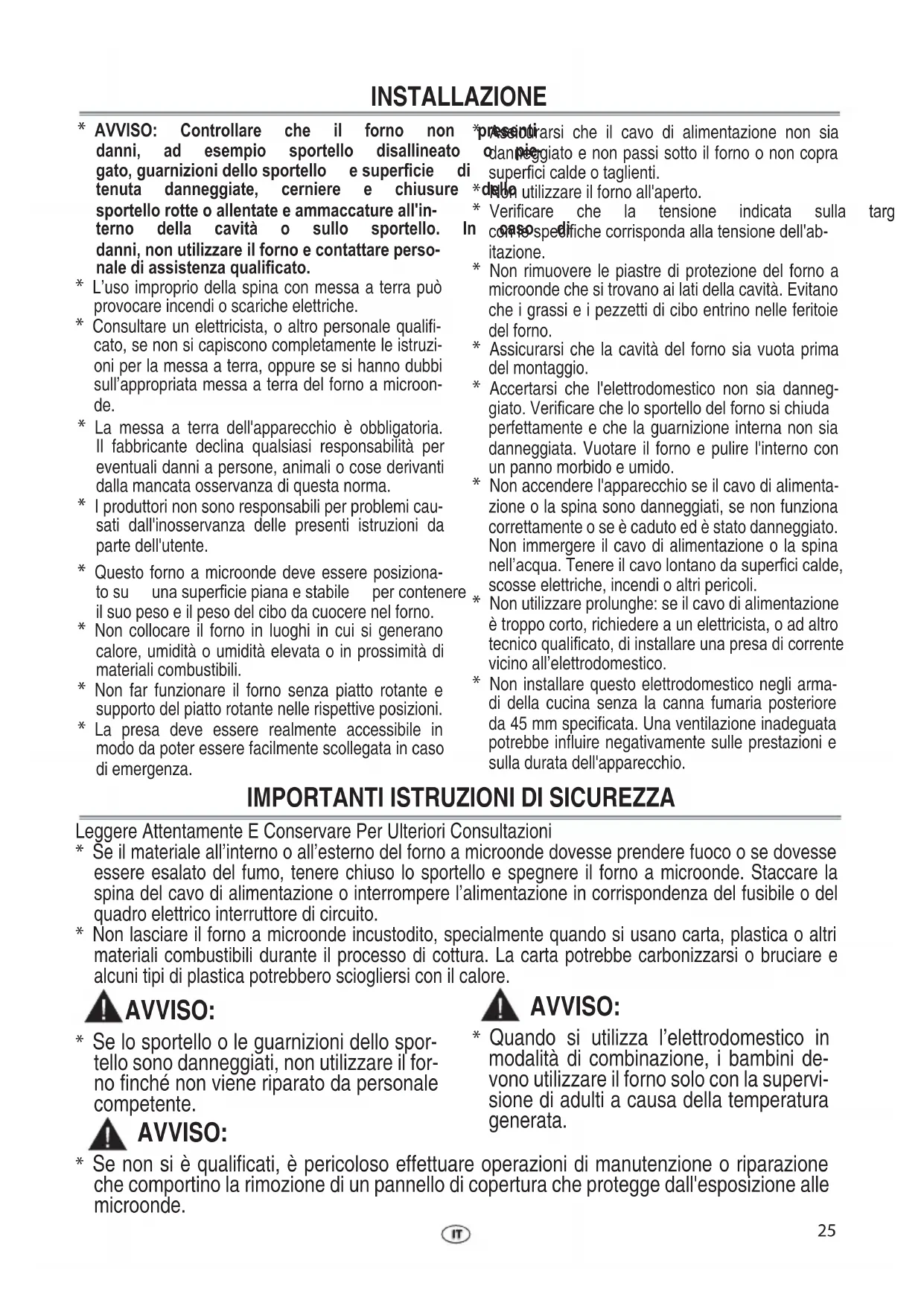 - Gli interventi di assistenza devono essere esclusivamente effettuati da personale tecnico qualificato/autorizzato. Suggeriamo pertanto di non pro- cedere alla rimozione dei pannelli di copertura del forno. Il cavo di alimentazione deve essere sostituito con cavo originale, da personale specializzato dispo- nibile tramite la rete di Centri di Assistenza Autorizzati. Il cavo di alimentazione deve essere sostitui- to solo da personale specializzato.27