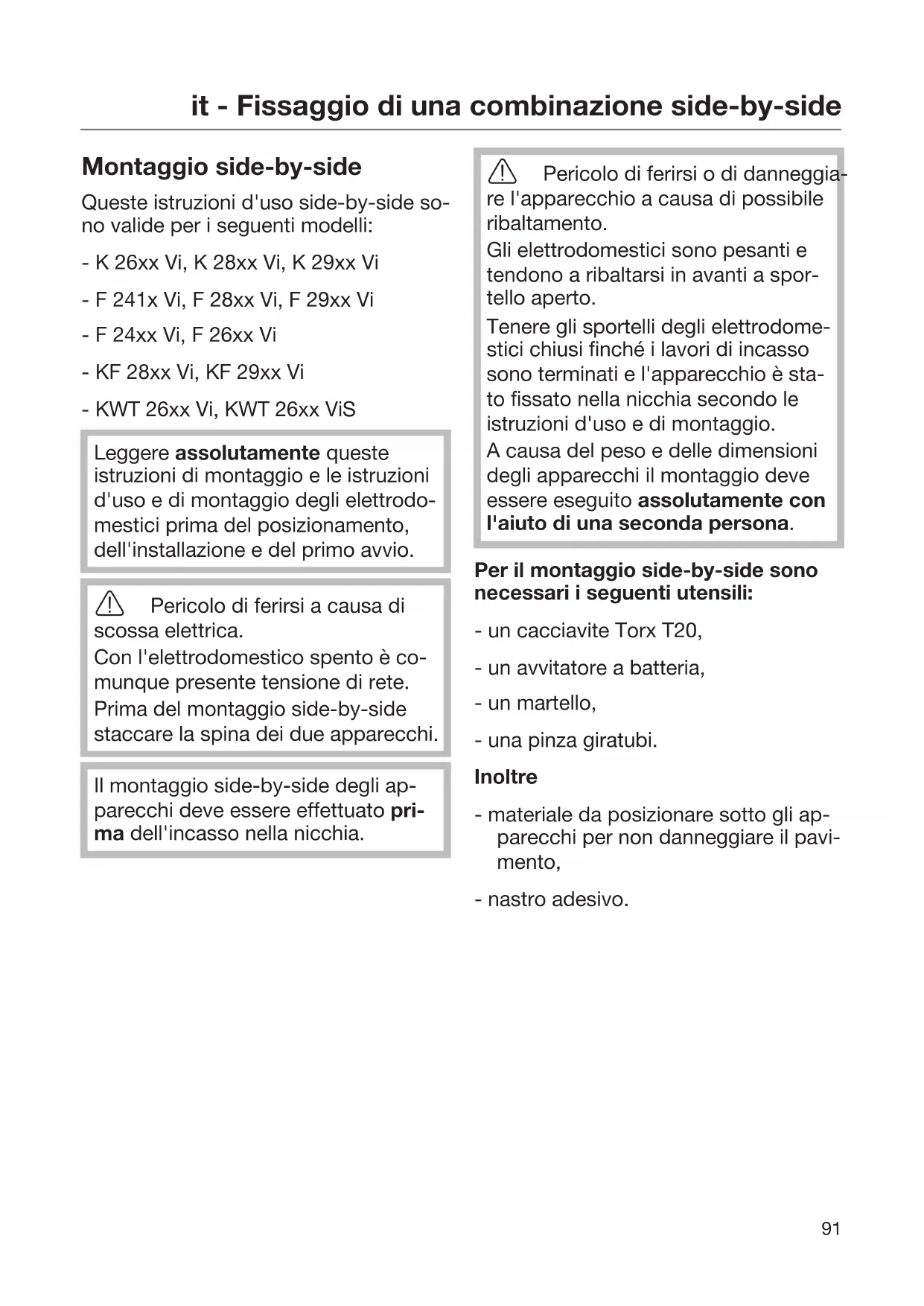 Montaggio side-by-side Queste istruzioni d'uso side-by-side so- no valide per i seguenti modelli: - K 26xx Vi, K 28xx Vi, K 29xx Vi - F 241x Vi, F 28xx Vi, F 29xx Vi - F 24xx Vi, F 26xx Vi - KF 28xx Vi, KF 29xx Vi - KWT 26xx Vi, KWT 26xx ViS Leggere assolutamente queste istruzioni di montaggio e le istruzioni d'uso e di montaggio degli elettrodo- mestici prima del posizionamento, dell'installazione e del primo avvio. Pericolo di ferirsi a causa di scossa elettrica. Con l'elettrodomestico spento è co- munque presente tensione di rete. Prima del montaggio side-by-side staccare la spina dei due apparecchi. Il montaggio side-by-side degli ap- parecchi deve essere effettuato pri- ma dell'incasso nella nicchia. Pericolo di ferirsi o di danneggia- re l'apparecchio a causa di possibile ribaltamento. Gli elettrodomestici sono pesanti e tendono a ribaltarsi in avanti a spor- tello aperto. Tenere gli sportelli degli elettrodome- stici chiusi finché i lavori di incasso sono terminati e l'apparecchio è sta- to fissato nella nicchia secondo le istruzioni d'uso e di montaggio. A causa del peso e delle dimensioni degli apparecchi il montaggio deve essere eseguito assolutamente con l'aiuto di una seconda persona. Per il montaggio side-by-side sono necessari i seguenti utensili: - un cacciavite Torx T20, - un avvitatore a batteria, - un martello, - una pinza giratubi. Inoltre - materiale da posizionare sotto gli ap- parecchi per non danneggiare il pavi- mento, - nastro adesivo.it - Fissaggio di una combinazione side-by-side