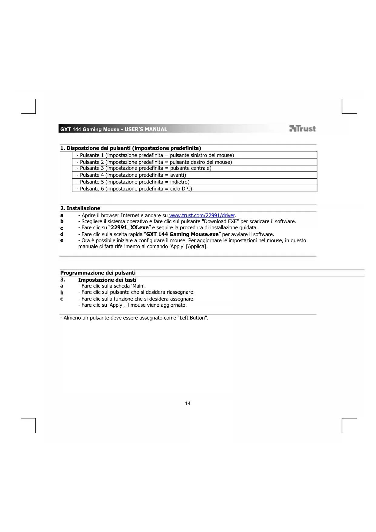 - Almeno un pulsante deve essere assegnato come “Left Button”.GXT 144 Gaming Mouse - USER’S MANUAL