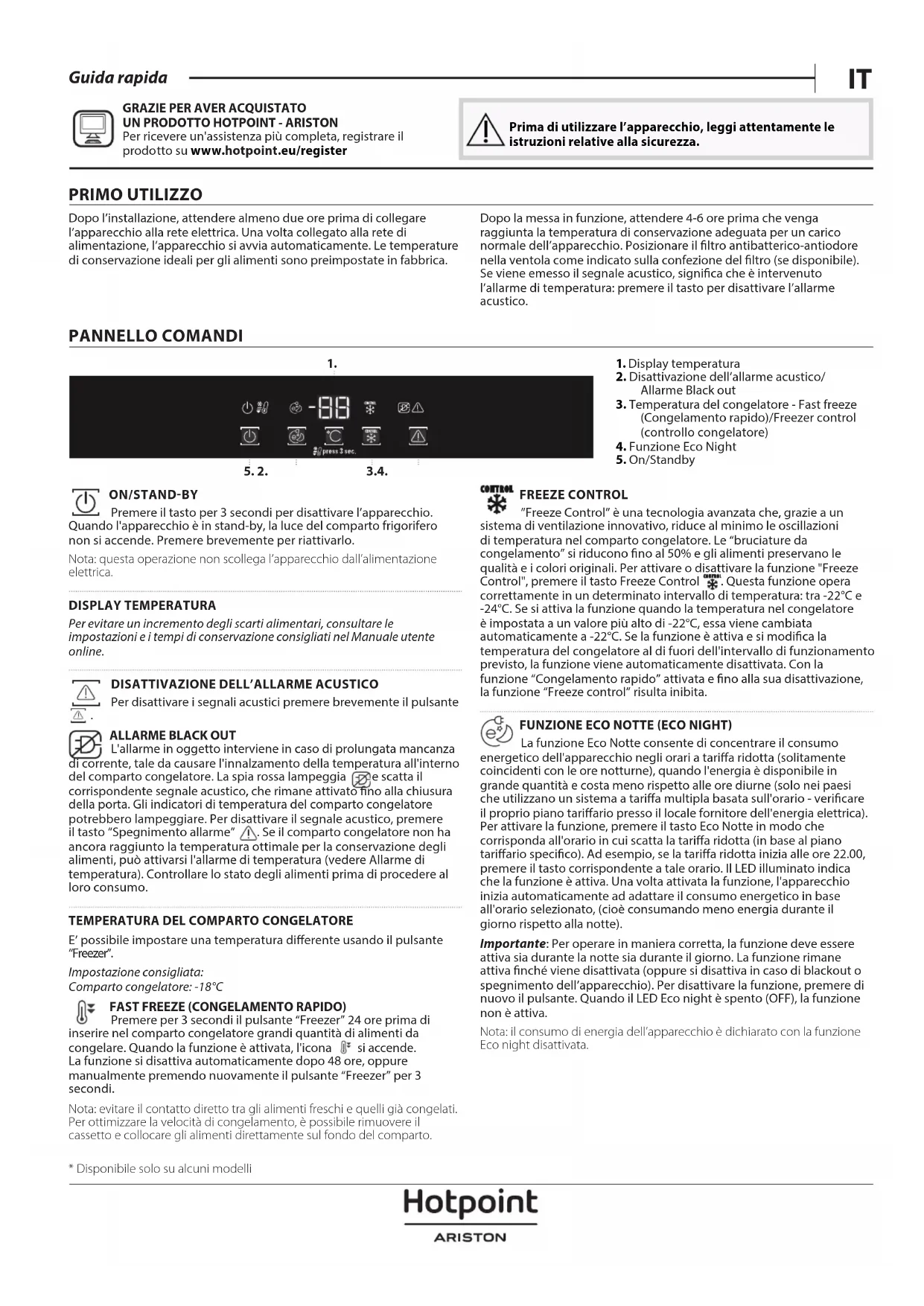 Per ricevere un'assistenza più completa, registrare il prodotto su www . hotpoint . eu/ register Prima di utilizzare l’apparecchio, leggi attentamente le istruzioni relative alla sicurezza. PRIMO UTILIZZO Dopo l’installazione, attendere almeno due ore prima di collegare l’apparecchio alla rete elettrica. Una volta collegato alla rete di alimentazione, l’apparecchio si avvia automaticamente. Le temperature di conservazione ideali per gli alimenti sono preimpostate in fabbrica. Dopo la messa in funzione, attendere 4-6 ore prima che venga raggiunta la temperatura di conservazione adeguata per un carico normale dell’apparecchio. Posizionare il ltro antibatterico-antiodore nella ventola come indicato sulla confezione del ltro (se disponibile). Se viene emesso il segnale acustico, signica che è intervenuto l’allarme di temperatura: premere il tasto per disattivare l’allarme acustico. PANNELLO COMANDI