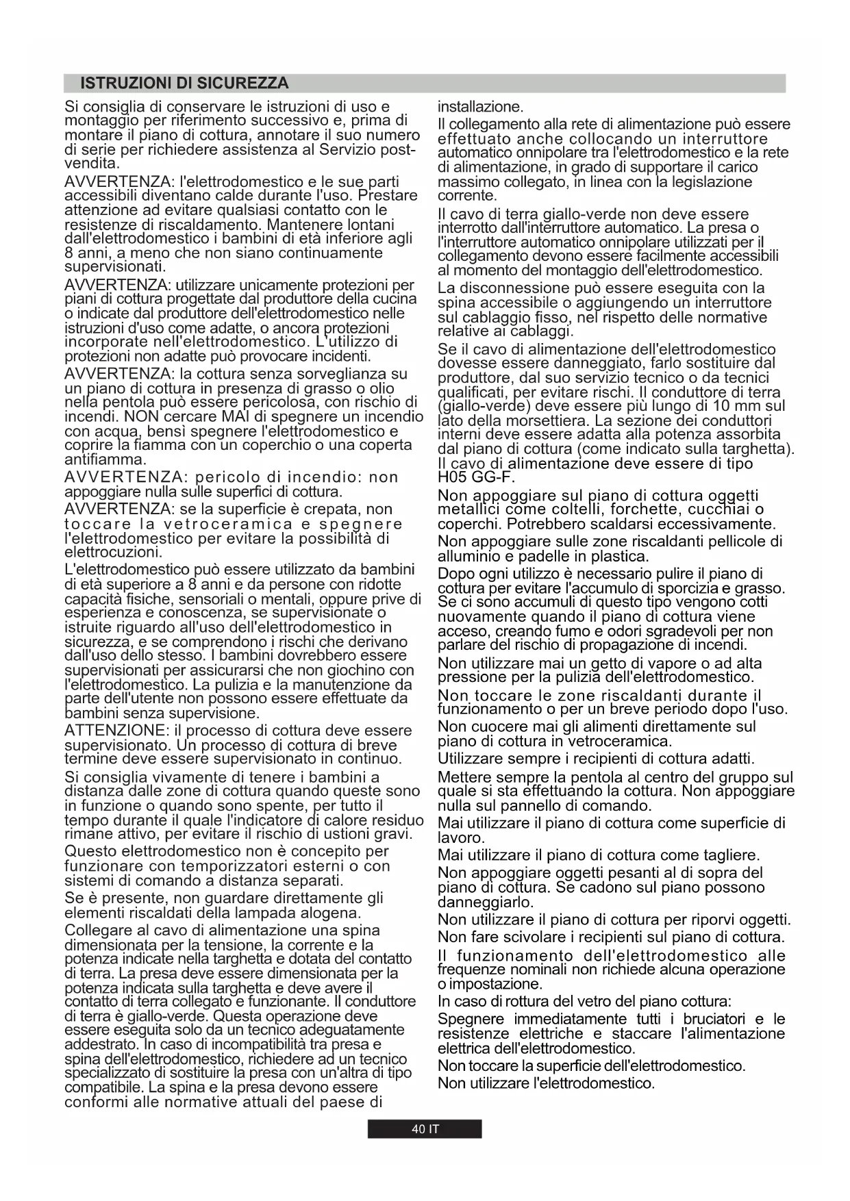 - da je dovod plina brezhiben DA40 IT AVVERTENZA: l'elettrodomestico e le sue parti accessibili diventano calde durante l'uso. Prestare attenzione ad evitare qualsiasi contatto con le resistenze di riscaldamento. Mantenere lontani dall'elettrodomestico i bambini di età inferiore agli 8 anni, a meno che non siano continuamente supervisionati. Si consiglia di conservare le istruzioni di uso e montaggio per riferimento successivo e, prima di montare il piano di cottura, annotare il suo numero di serie per richiedere assistenza al Servizio post- vendita. AVVERTENZA: la cottura senza sorveglianza su un piano di cottura in presenza di grasso o olio nella pentola può essere pericolosa, con rischio di incendi. NON cercare MAI di spegnere un incendio con acqua, bensì spegnere l'elettrodomestico e coprire la fiamma con un coperchio o una coperta antifiamma. AVVERTENZA: pericolo di incendio: non appoggiare nulla sulle superfici di cottura. AVVERTENZA: utilizzare unicamente protezioni per piani di cottura progettate dal produttore della cucina o indicate dal produttore dell'elettrodomestico nelle istruzioni d'uso come adatte, o ancora protezioni incorporate nell'elettrodomestico. L'utilizzo di protezioni non adatte può provocare incidenti. AVVERTENZA: se la superficie è crepata, non toccare la vetroceramica e spegnere l'elettrodomestico per evitare la possibilità di elettrocuzioni. L'elettrodomestico può essere utilizzato da bambini di età superiore a 8 anni e da persone con ridotte capacità fisiche, sensoriali o mentali, oppure prive di esperienza e conoscenza, se supervisionate o istruite riguardo all'uso dell'elettrodomestico in sicurezza, e se comprendono i rischi che derivano dall'uso dello stesso. I bambini dovrebbero essere supervisionati per assicurarsi che non giochino con l'elettrodomestico. La pulizia e la manutenzione da parte dell'utente non possono essere effettuate da bambini senza supervisione. ATTENZIONE: il processo di cottura deve essere supervisionato. Un processo di cottura di breve termine deve essere supervisionato in continuo. Si consiglia vivamente di tenere i bambini a distanza dalle zone di cottura quando queste sono in funzione o quando sono spente, per tutto il tempo durante il quale l'indicatore di calore residuo rimane attivo, per evitare il rischio di ustioni gravi. Questo elettrodomestico non è concepito per funzionare con temporizzatori esterni o con sistemi di comando a distanza separati. Collegare al cavo di alimentazione una spina dimensionata per la tensione, la corrente e la potenza indicate nella targhetta e dotata del contatto di terra. La presa deve essere dimensionata per la potenza indicata sulla targhetta e deve avere il contatto di terra collegato e funzionante. Il conduttore di terra è giallo-verde. Questa operazione deve essere eseguita solo da un tecnico adeguatamente addestrato. In caso di incompatibilità tra presa e spina dell'elettrodomestico, richiedere ad un tecnico specializzato di sostituire la presa con un'altra di tipo compatibile. La spina e la presa devono essere conformi alle normative attuali del paese di Se è presente, non guardare direttamente gli elementi riscaldati della lampada alogena.