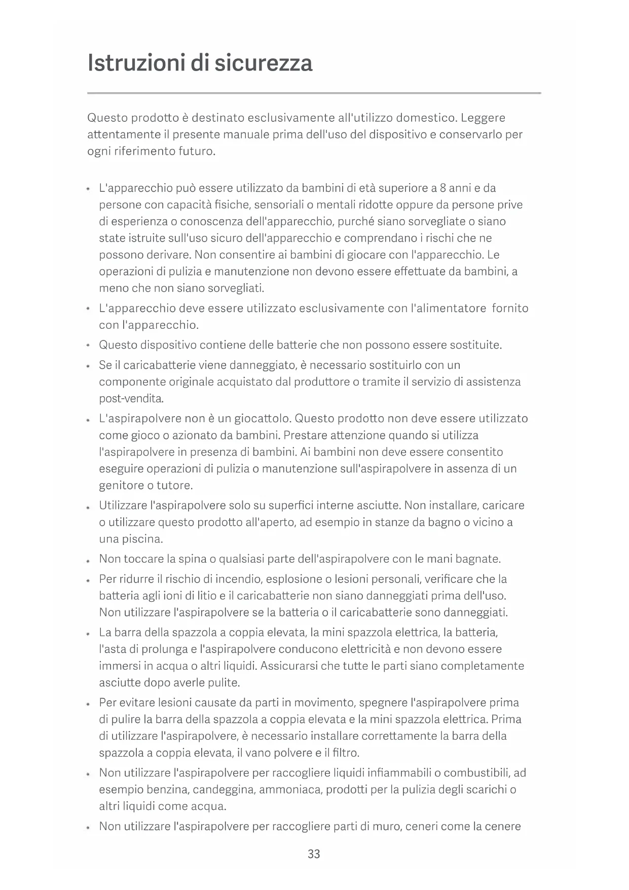 Hinweis: Der Staubsauger muss vor dem Entfernen des Akkus ausgeschaltet werden. Der Akku sollte auf sichere Weise entsorgt werden. Vorsichtsmaßnahmen bei der Verwendung von Akkus Der Staubsauger befindet sich im Bereitschasmodus und kann während des Ladevorgangs nicht verwendet werden. Das Lithium-Ionen-Akku Pack enthält umweltgefährdende Stoffe. Bevor der Staubsauger entsorgt wird, muss zunächst das Akku Pack entfernt werden, anschließend muss in Übereinstimmung mit den lokalen Gesetzen und Vorschrien des Landes oder der Region, in dem er benutzt wurde, eine Entsorgung oder Wiederverwertung stafinden.33 Istruzioni di sicurezza Questo prodoo è destinato esclusivamente all'utilizzo domestico. Leggere aentamente il presente manuale prima dell'uso del dispositivo e conservarlo per ogni riferimento futuro. L'apparecchio può essere utilizzato da bambini di età superiore a 8 anni e da persone con capacità fisiche, sensoriali o mentali ridoe oppure da persone prive di esperienza o conoscenza dell'apparecchio, purché siano sorvegliate o siano state istruite sull'uso sicuro dell'apparecchio e comprendano i rischi che ne possono derivare. Non consentire ai bambini di giocare con l'apparecchio. Le operazioni di pulizia e manutenzione non devono essere effeuate da bambini, a meno che non siano sorvegliati. L'apparecchio deve essere utilizzato esclusivamente con l'alimentatore fornito con l'apparecchio. Questo dispositivo contiene delle baerie che non possono essere sostituite. Se il caricabaerie viene danneggiato, è necessario sostituirlo con un componente originale acquistato dal produore o tramite il servizio di assistenza post-vendita. L'aspirapolvere non è un giocaolo. Questo prodoo non deve essere utilizzato come gioco o azionato da bambini. Prestare aenzione quando si utilizza l'aspirapolvere in presenza di bambini. Ai bambini non deve essere consentito eseguire operazioni di pulizia o manutenzione sull'aspirapolvere in assenza di un genitore o tutore. Utilizzare l'aspirapolvere solo su superfici interne asciue. Non installare, caricare o utilizzare questo prodoo all'aperto, ad esempio in stanze da bagno o vicino a una piscina. Non toccare la spina o qualsiasi parte dell'aspirapolvere con le mani bagnate. Per ridurre il rischio di incendio, esplosione o lesioni personali, verificare che la baeria agli ioni di litio e il caricabaerie non siano danneggiati prima dell'uso. Non utilizzare l'aspirapolvere se la baeria o il caricabaerie sono danneggiati. La barra della spazzola a coppia elevata, la mini spazzola elerica, la baeria, l'asta di prolunga e l'aspirapolvere conducono elericità e non devono essere immersi in acqua o altri liquidi. Assicurarsi che tue le parti siano completamente asciue dopo averle pulite. Per evitare lesioni causate da parti in movimento, spegnere l'aspirapolvere prima di pulire la barra della spazzola a coppia elevata e la mini spazzola elerica. Prima di utilizzare l'aspirapolvere, è necessario installare correamente la barra della spazzola a coppia elevata, il vano polvere e il filtro. Non utilizzare l'aspirapolvere per raccogliere liquidi infiammabili o combustibili, ad esempio benzina, candeggina, ammoniaca, prodoi per la pulizia degli scarichi o altri liquidi come acqua. Non utilizzare l'aspirapolvere per raccogliere parti di muro, ceneri come la cenere34 del camino o materiali incandescenti come carbone, mozziconi di sigarea o fiammiferi. Non utilizzare l'aspirapolvere per raccogliere oggei duri o taglienti, ad esempio vetro, chiodi, viti o monete, che potrebbero danneggiarlo. Assicurarsi di tenere capelli, abiti larghi, dita e altre parti del corpo lontano dalle bocchee e dalle parti in movimento dell'aspirapolvere. Non puntare la bocchea di aspirazione, l'asta di prolunga o altri accessori verso gli occhi o le orecchie, né meerli in bocca. Non inserire oggei nelle bocchee dell'aspirapolvere, né utilizzare l'aspirapolvere con le bocchee ostruite. Rimuovere polvere, lanugine, capelli o altri elementi che potrebbero ridurre il flusso dell'aria. Non appoggiare l'aspirapolvere contro una sedia, un tavolo o altre superfici instabili per evitare il rischio di danni al prodoo o lesioni personali. Se l'aspirapolvere non funziona correamente a causa di un urto o un danneggiamento, contaare il nostro reparto di assistenza autorizzato. Non tentare mai di smontare autonomamente l'aspirapolvere. Utilizzare esclusivamente il caricabaerie originale per ricaricare il prodoo in luoghi in cui la temperatura ambiente è compresa tra 0°C e 35°C; diversamente, la baeria rischia di danneggiarsi. Prima di utilizzare l'aspirapolvere, è necessario installare correamente il vano polvere, il filtro per il cotone, il separatore ciclonico e il filtro. Assicurarsi che l'aspirapolvere sia scollegato dalla corrente quando non viene utilizzato per lunghi periodi di tempo e prima di eseguire interventi di manutenzione o riparazioni. Prestare la massima aenzione quando si utilizza l'aspirapolvere per pulire scale. AVVERTENZA: Non applicare alcun tipo di profumo sul filtro dell'aspirapolvere. In genere, questa tipologia di prodoi contiene sostanze chimiche infiammabili, che rischiano di far incendiare l'aspirapolvere. NON esporre l'apparecchio al fuoco poiché ciò potrebbe causare esplosioni. NON esporre o immergere l'apparecchio in acqua, acqua salata o altri liquidi. Aenersi scrupolosamente alle istruzioni di questo manuale utente durante l'utilizzo dell'aspirapolvere. Gli utenti sono responsabili di eventuali perdite o danni derivanti dall'uso improprio dell'aspirapolvere. Il manuale eleronico deagliato è disponibile all'indirizzo www.mi.com/global/service/userguide Con la presente, Guangdong Deerma Technology Co., Ltd. dichiara che questo apparecchio è conforme alle direive applicabili e alle norme europee, nonché ai relativi emendamenti. Il testo completo della dichiarazione di conformità UE è disponibile al seguente indirizzo Internet: hp://www.mi.com/global/service/su