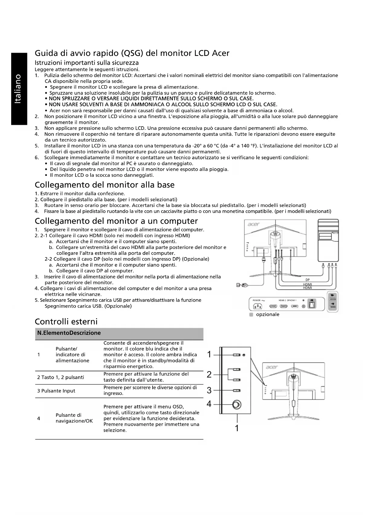 4Italiano Norme e avvisi di sicurezza Normative FCC Questo dispositivo è stato testato ed è risultato conforme ai limiti stabiliti per i dispositivi digitali di Classe B, ai sensi della Parte 15 delle Normative FCC. Tali limiti sono stati stabiliti per fornire una ragionevole protezione da interferenze nocive presenti nelle installazioni residenziali. Questo dispositivo genera, utilizza e può emettere frequenze radio, e se non è installato e utilizzato secondo le istruzioni, può causare un'interferenza dannosa alle comunicazioni radio. Tuttavia, non vi è alcuna garanzia che l'interferenza non si verifichi in particolari installazioni. Se il dispositivo causa un'interferenza dannosa alla ricezione di radio e televisori, che può essere determinata spegnendo e accendendo il dispositivo, si prega l'utente di correggere l'interferenza applicando una o più delle seguenti misure: Riorientare o riposizionare l'antenna di ricezione. Aumentare la distanza tra il dispositivo e il ricevitore. Collegare il dispositivo a una presa su un circuito diverso da quello a cui è collegato il ricevitore. Per assistenza, contattare il rivenditore o un tecnico professionista nell'ambito di radio e televisori. Dichiarazione di conformità CE Con il presente documento, Acer Inc., dichiara che questo monitor LCD è conforme ai requisiti essenziali e ad altre normative pertinenti della Direttiva EMC 2014/30/UE, alla Direttiva sulla bassa tensione 2014/35/UE e alla Direttiva RoHS 2011/65/UE e alla Direttiva 2009/125/CE con riferimento all'istituzione di un quadro per l'elaborazione di specifiche per la progettazione ecocompatibile dei prodotti connessi al consumo energetico. Avviso: Per impedire danni al monitor, non sollevare il monitor per la sua base. Avviso: Cavi schermati Tutte i collegamenti ad altri dispositivi di elaborazione devono essere effettuati utilizzando cavi schermati per mantenere la conformità alle normative EMC. Avviso: Dispositivi periferici È possibile collegare a questa apparecchiatura solo le periferiche (dispositivi in ingresso/uscita, terminali, stampanti, ecc.) certificate per la conformità ai limiti della Classe B. L'uso di periferiche non certificate può causare interferenze alla ricezione di radio e TV. Avvertenza Eventuali modifiche o cambiamenti non espressamente approvati dal produttore potrebbero annullare l'autorità dell'utente, concessa dalla Federal Communications Commission, a utilizzare questo prodotto. Condizioni di utilizzo Questo dispositivo è conforme alla Parte 15 delle Normative FCC. L'utilizzo è soggetto alle seguenti due condizioni: (1) il dispositivo non deve causare interferenze dannose e (2) deve accettare tutte le interferenze ricevute, comprese quelle che possono causare un funzionamento indesiderato. Avviso: Utenti canadesi Questo apparecchio digitale di classe B è conforme alla normativa canadese ICES-003. Remarque à l'intention des utilisateurs canadiens Cet appareil numérique de la classe B est conforme à la norme NMB-003 du Canada. Smaltimento dei dispositivi utilizzati da parte di utenti privati nell'Unione Europea Questo simbolo sul prodotto o sulla confezione indica che il prodotto non deve essere smaltito insieme ai rifiuti domestici. È quindi responsabilità dell'utente smaltirlo portandolo presso un centro di raccolta autorizzato per il riciclo delle apparecchiature elettriche ed elettroniche. La raccolta differenziata e il riciclaggio di tali rifiuti provenienti da apparecchiature nel momento dello smaltimento aiuteranno a preservare le risorse naturali e garantiranno un riciclaggio adatto a proteggere il benessere dell'uomo e dell'ambiente. Per maggiori informazioni sui centri di raccolta, contattare il proprio ufficio locale, il servizio di smaltimento rifiuti o il negozio presso il quale è stato acquistato il prodotto.Italiano SPECIFICHE I manuali e altri documenti relativi al prodotto Acer sono disponibili sul sito Web di assistenza ufficiale Acer.