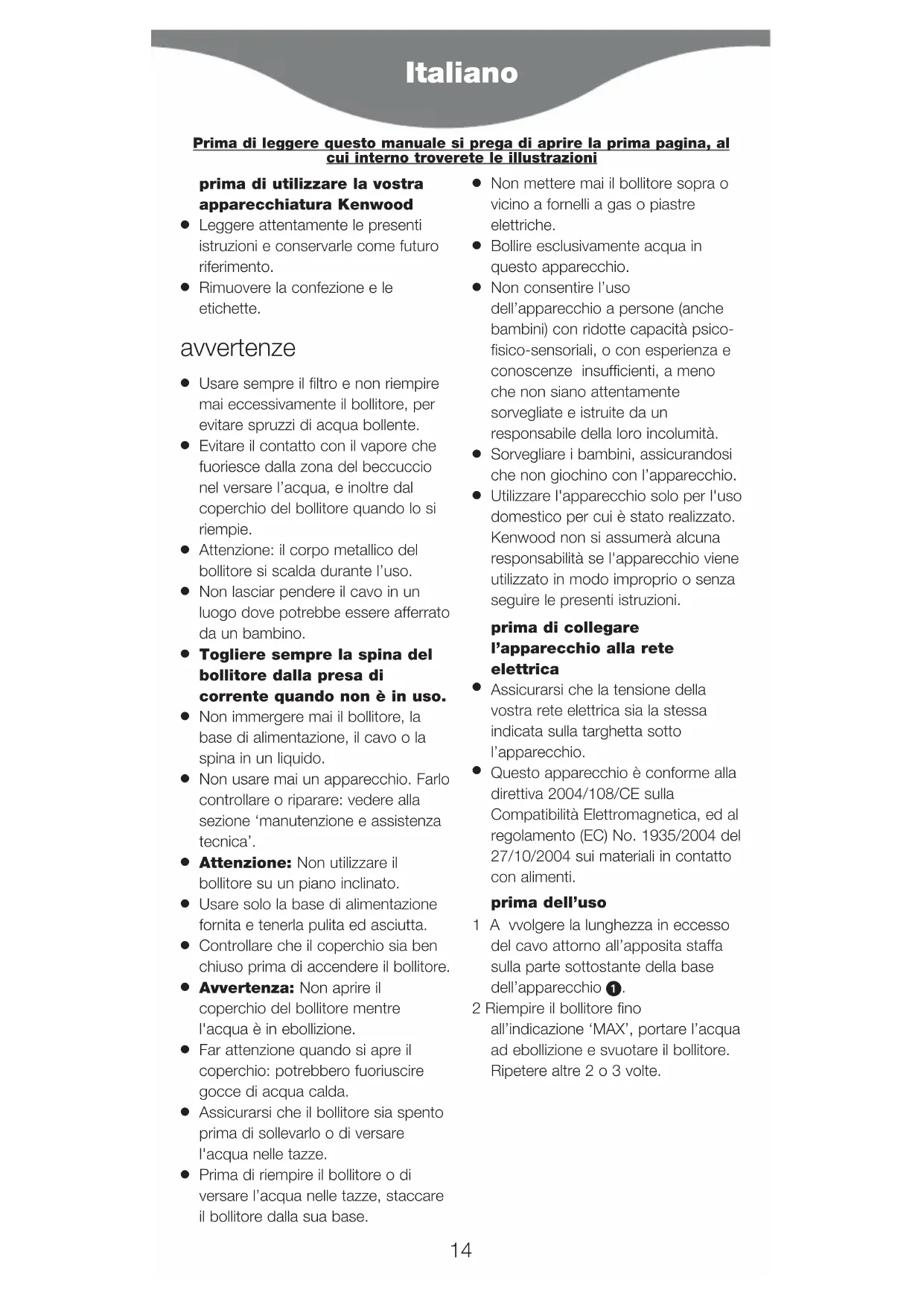 Questo apparecchio è conforme alla direttiva 2004/108/CE sulla Compatibilità Elettromagnetica, ed al regolamento (EC) No. 1935/2004 del 27/10/2004 sui materiali in contatto con alimenti. prima dell’uso 1Avvolgere la lunghezza in eccesso del cavo attorno all’apposita staffa sulla parte sottostante della base dell’apparecchio . 2 Riempire il bollitore fino all’indicazione ‘MAX’, portare l’acqua ad ebollizione e svuotare il bollitore. Ripetere altre 2 o 3 volte. Italiano