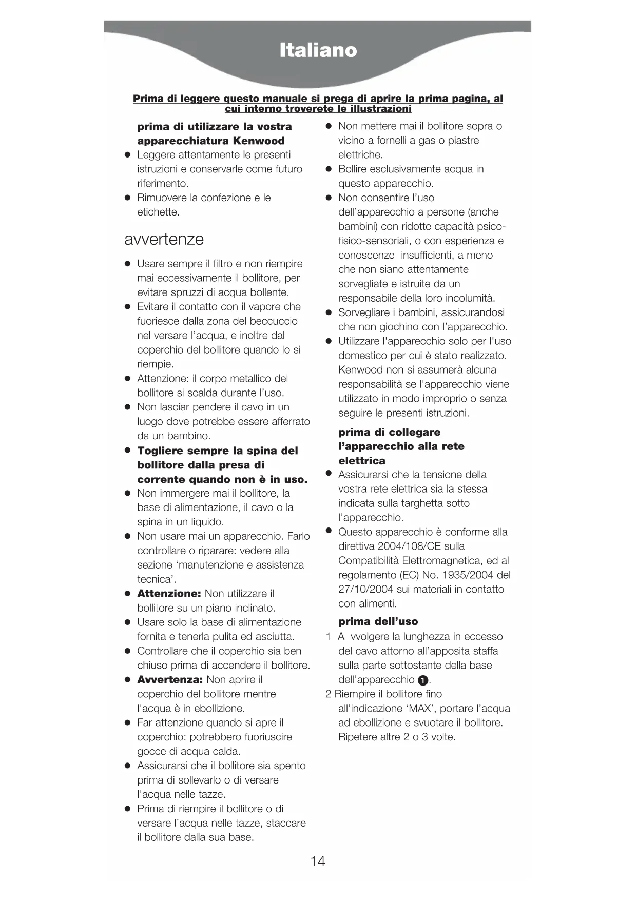Questo apparecchio è conforme alla direttiva 2004/108/CE sulla Compatibilità Elettromagnetica, ed al regolamento (EC) No. 1935/2004 del 27/10/2004 sui materiali in contatto con alimenti. prima dell’uso 1Avvolgere la lunghezza in eccesso del cavo attorno all’apposita staffa sulla parte sottostante della base dell’apparecchio . 2 Riempire il bollitore fino all’indicazione ‘MAX’, portare l’acqua ad ebollizione e svuotare il bollitore. Ripetere altre 2 o 3 volte. Italiano