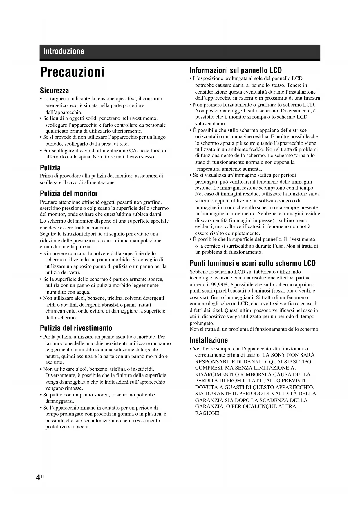 COLLEGATO A MASSA. Trasporto Durante il trasporto del display, tenere l’apparecchio stesso, non i diffusori. Diversamente, è possibile che i diffusori fuoriescano dall’apparecchio e che quest’ultimo cada provocando ferite. AVVERTENZA Durante l’installazione dell’apparecchio, incorporare un dispositivo di scollegamento prontamente accessibile nel cablaggio fisso, oppure collegare la spina di alimentazione ad una presa di corrente facilmente accessibile vicina all’apparecchio. Qualora si verifichi un guasto durante il funzionamento dell’apparecchio, azionare il dispositivo di scollegamento in modo che interrompa il flusso di corrente oppure scollegare la spina di alimentazione. Per i clienti in Europa Il fabbricante di questo prodotto e la Sony Corporation, 1-7-1 Konan, Minato-ku, Tokyo, Giappone. La rappresentanza autorizzata per EMC e la sicurezza dei prodotti e la Sony Deutschland GmbH, Hedelfinger Strasse 61, 70327 Stoccarda, Germania. Per qualsiasi questione riguardante l’assistenza o la garanzia, si prega di rivolgersi agli indirizzi riportati nei documenti sull’assistenza o sulla garanzia a parte. AVVERTENZA