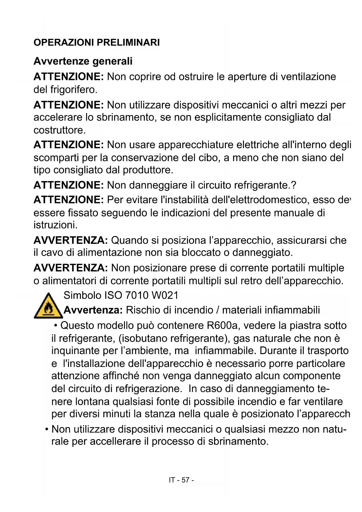 OPERAZIONI PRELIMINARI Avvertenze generali ATTENZIONE: Non coprire od ostruire le aperture di ventilazione del frigorifero. ATTENZIONE: Non utilizzare dispositivi meccanici o altri mezzi per accelerare lo sbrinamento, se non esplicitamente consigliato dal costruttore. ATTENZIONE: Non usare apparecchiature elettriche all'interno degli scomparti per la conservazione del cibo, a meno che non siano del tipo consigliato dal produttore. ATTENZIONE: Non danneggiare il circuito refrigerante.? ATTENZIONE: Per evitare l'instabilità dell'elettrodomestico, esso deve essere fissato seguendo le indicazioni del presente manuale di istruzioni. AVVERTENZA: Quando si posiziona l’apparecchio, assicurarsi che il cavo di alimentazione non sia bloccato o danneggiato. AVVERTENZA: Non posizionare prese di corrente portatili multiple o alimentatori di corrente portatili multipli sul retro dell’apparecchio. Simbolo ISO 7010 W021 Avvertenza: Rischio di incendio / materiali infiammabili