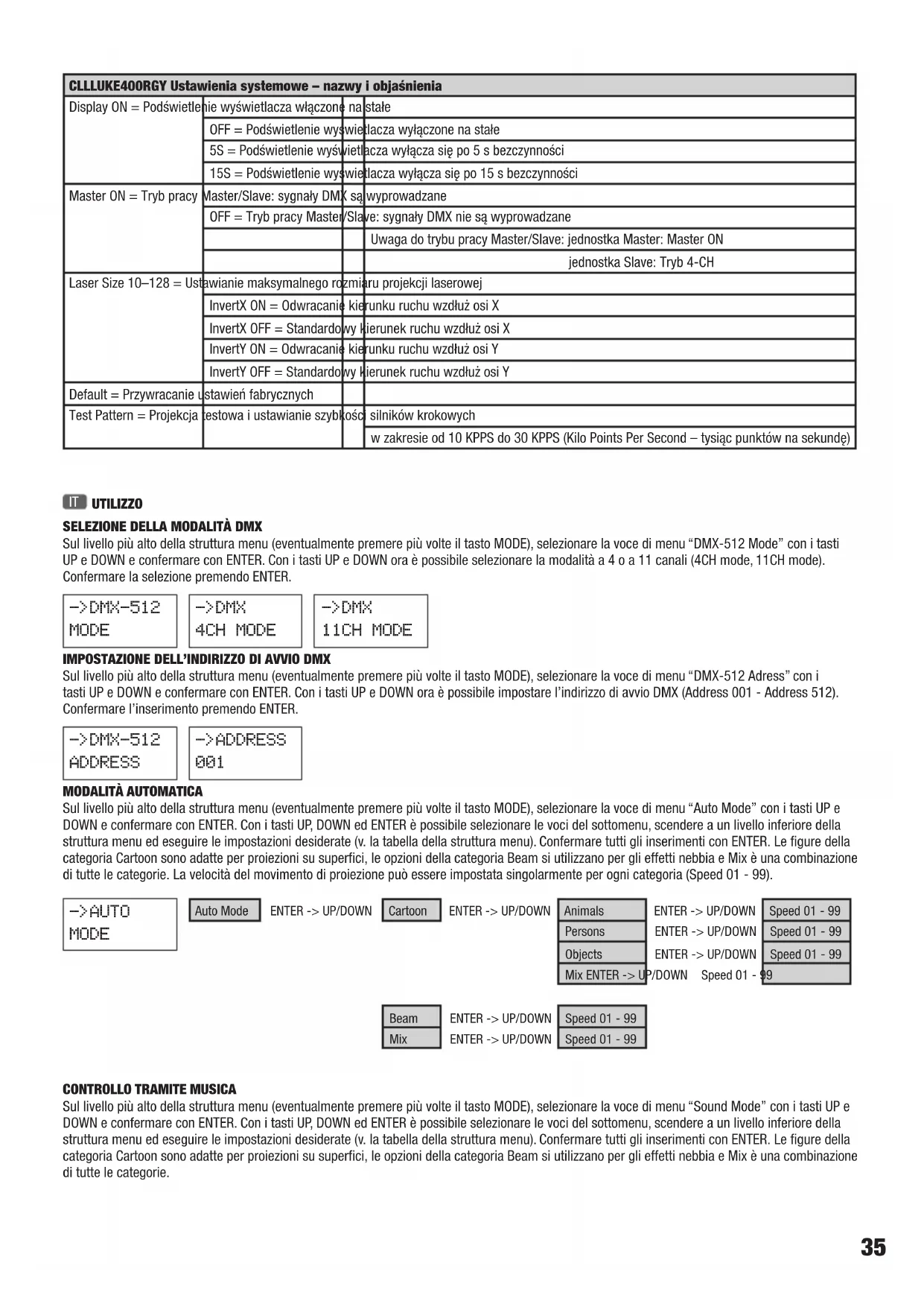 15S Master ENTER -> UP/DOWN ON OFF Laser ENTER -> UP/DOWN Size ENTER -> UP/DOWN Size 10 - 128 InvertX ENTER -> UP/DOWN ON OFF InvertY ENTER -> UP/DOWN ON OFF Default ENTER Test Pattern ENTER -> UP/DOWN Scanner 10 - 30KPPS38 CLLLUKE400RGY: impostazioni di sistema. Termini e descrizioni Display ON = Illuminazione del display sempre accesa OFF = Illuminazione del display sempre spenta 5S = L'illuminazione del display si spegne dopo 5secondi di inattività 15S = L'illuminazione del display si spegne dopo 15secondi di inattività Master ON = Funzionamento master/slave: con segnale DMX OFF = Funzionamento master/slave: senza segnale DMX Nota sulla modalità master/slave: Unità master: Master ON Unità slave: modalità 4 canali Laser Size 10 - 128 = Impostazione delle dimensioni massime della proiezione laser InvertX ON = Inversione della direzione di giro dell'asse X InvertX OFF = Direzione di giro dell'asse X standard InvertY ON = Inversione della direzione di giro dell'asse Y InvertY OFF = Direzione di giro dell'asse Y standard Default = Ripristino delle impostazioni di fabbrica Test Pattern = Proiezione di prova e impostazione della velocità dei motori passo-passo da 10kpps a 30kpps (Kilo Points Per Second, ovvero chilo-punti per secondo)39 DMX CONTROL / DMX STEUERUNG / PILOTAGE DMX / CONTROL DMX / STEROWANIE DMX / CONTROLLO DMX 4-CH Mode LUKE400RGY CH1