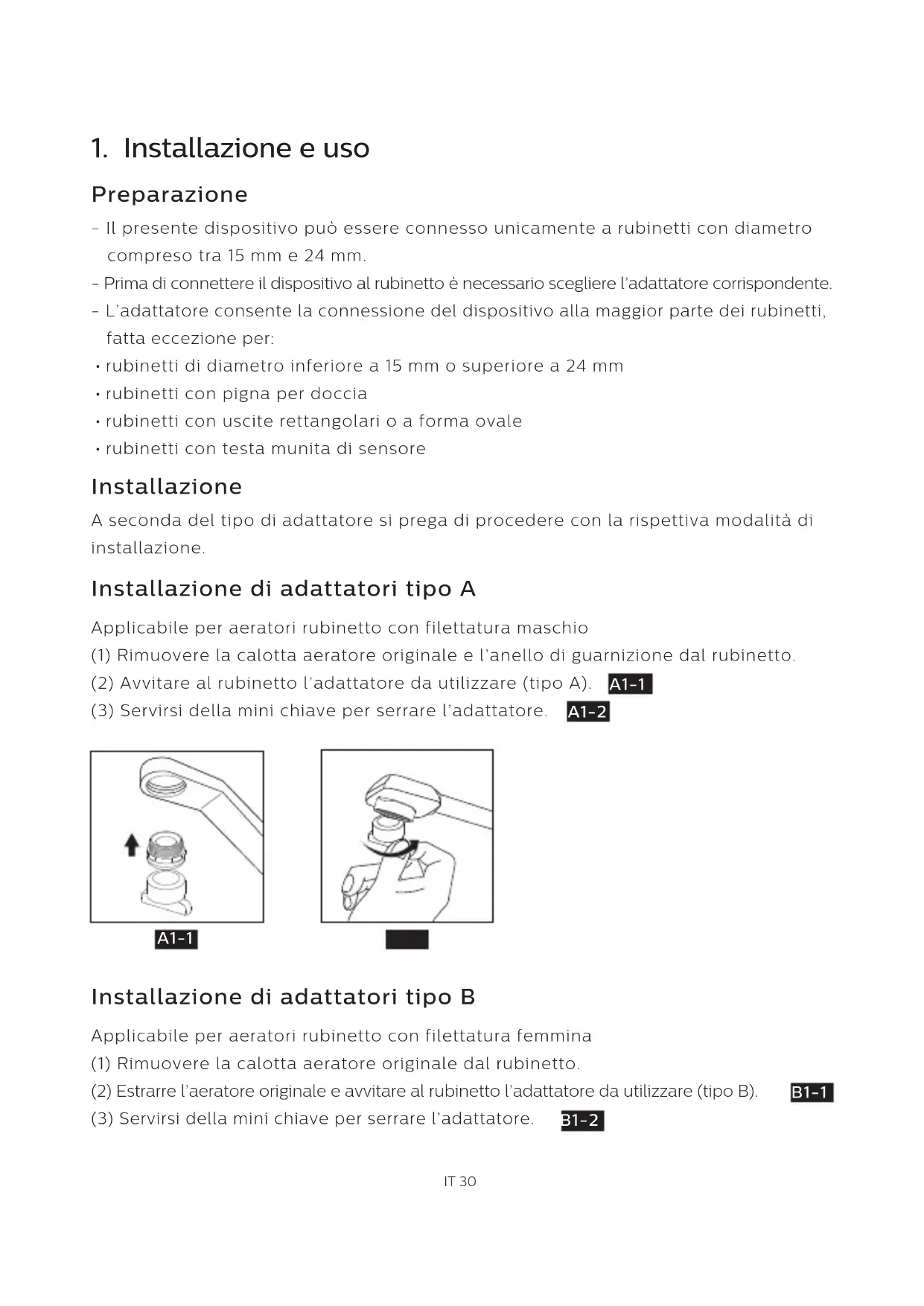 - rubinetti con testa munita di sensore Installazione Preparazione A seconda del tipo di adattatore si prega di procedere con la rispettiva modalità di installazione. Installazione di adattatori tipo A Applicabile per aeratori rubinetto con filettatura maschio (1) Rimuovere la calotta aeratore originale e l’anello di guarnizione dal rubinetto. (2) Avvitare al rubinetto l’adattatore da utilizzare (tipo A). (3) Servirsi della mini chiave per serrare l’adattatore. Installazione di adattatori tipo B Applicabile per aeratori rubinetto con filettatura femmina (1) Rimuovere la calotta aeratore originale dal rubinetto. (2) Estrarre l’aeratore originale e avvitare al rubinetto l’adattatore da utilizzare (tipo B). (3) Servirsi della mini chiave per serrare l’adattatore. IT 30 B1-1 B1-2 A1-1 A1-1 A1-2 A1-2Installazione di adattatori tipo C Applicabile per rubinetti diversi da A o B e con diametro compreso tra 15 mm e 21 mm. Prima di procedere con l’installazione, approntare un cacciavite a intaglio. Adattatore tipo C (1) A seconda delle dimensioni dell’uscita del rubinetto potrà essere necessario applicare l’anello di guarnizione interno o esterno dell’adattatore tipo C. (2) Combinare l’adattatore tipo A con l’adattatore tipo C. (3) Regolare e avvitare l’adattatore combinato al rubinetto.