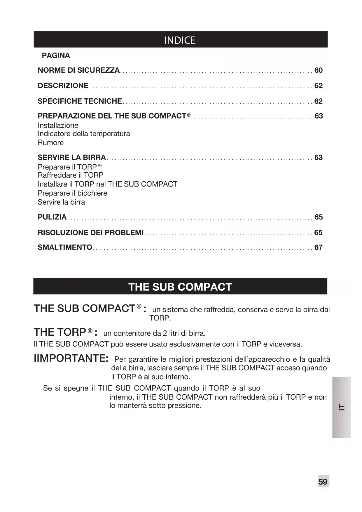 : un contenitore da 2 litri di birra. Il THE SUB COMPACT può essere usato esclusivamente con il TORP e viceversa. IIMPORTANTE: Per garantire le migliori prestazioni dell’apparecchio e la qualità della birra, lasciare sempre il THE SUB COMPACT acceso quando il TORP è al suo interno. Se si spegne il THE SUB COMPACT quando il TORP è al suo interno, il THE SUB COMPACT non raffredderà più il TORP e non lo manterrà sotto pressione.60