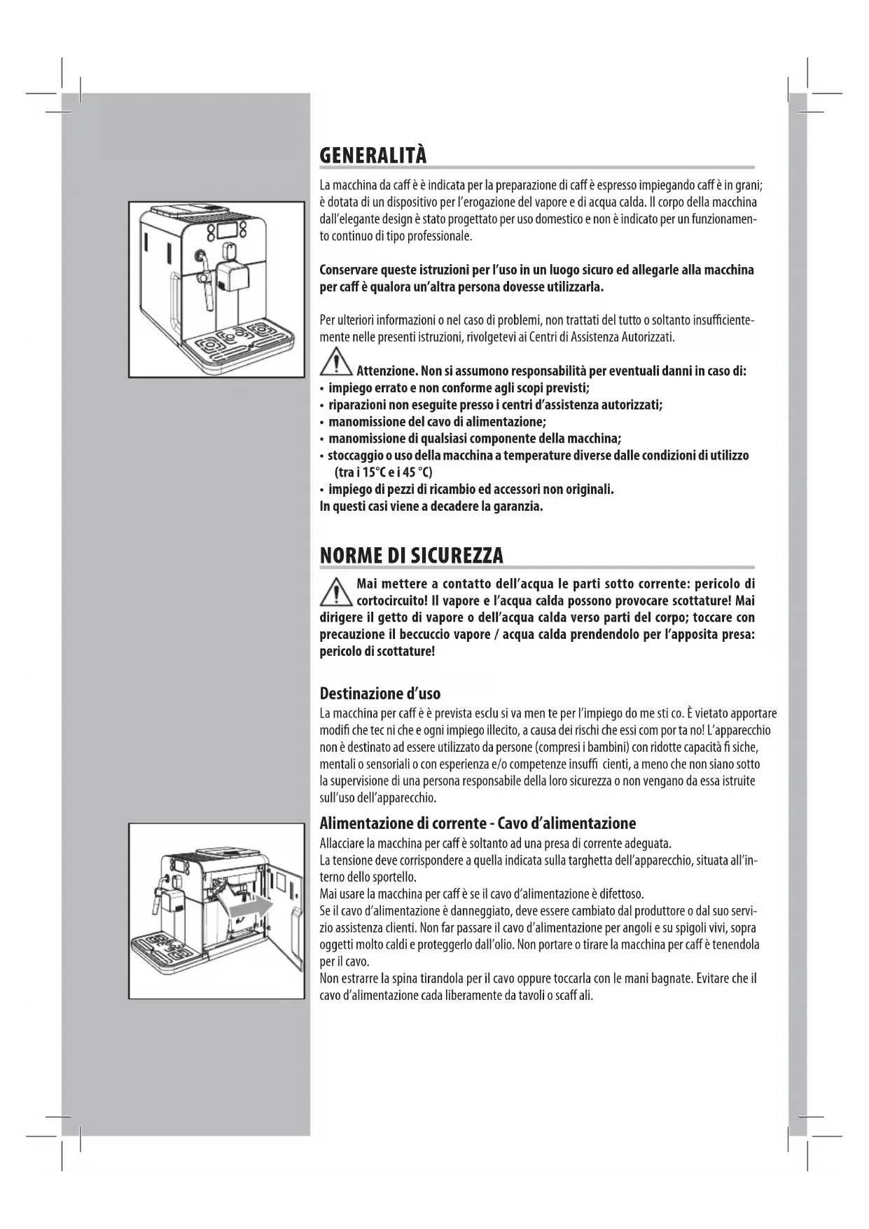 LEGGERE ATTENTAMENTE QUESTE ISTRUZIONI D'USO PRIMA DI UTILIZZARE LA MACCHINA. READ THESE OPERATING INSTRUCTIONS CAREFULLY BEFORE USING THE MACHINE. DIESE BEDIENUNGSANLEITUNG IST VOR DEM ERSTEN GEBRAUCH DER MASCHINE AUFMERKSAM ZU LESEN. LIRE ATTENTIVEMENT CES INSTRUCTIONS AVANT D’UTILISER LA MACHINE. ItalianoEnglishDeutschFrançais• 2 • GENERALITÀ La macchina da ca è è indicata per la preparazione di ca è espresso impiegando ca è in grani; è dotata di un dispositivo per l’erogazione del vapore e di acqua calda. Il corpo della macchina dall’elegante design è stato progettato per uso domestico e non è indicato per un funzionamen- to continuo di tipo professionale. Conservare queste istruzioni per l’uso in un luogo sicuro ed allegarle alla macchina per ca è qualora un’altra persona dovesse utilizzarla. Per ulteriori informazioni o nel caso di problemi, non trattati del tutto o soltanto insu ciente- mente nelle presenti istruzioni, rivolgetevi ai Centri di Assistenza Autorizzati. Attenzione. Non si assumono responsabilità per eventuali danni in caso di: