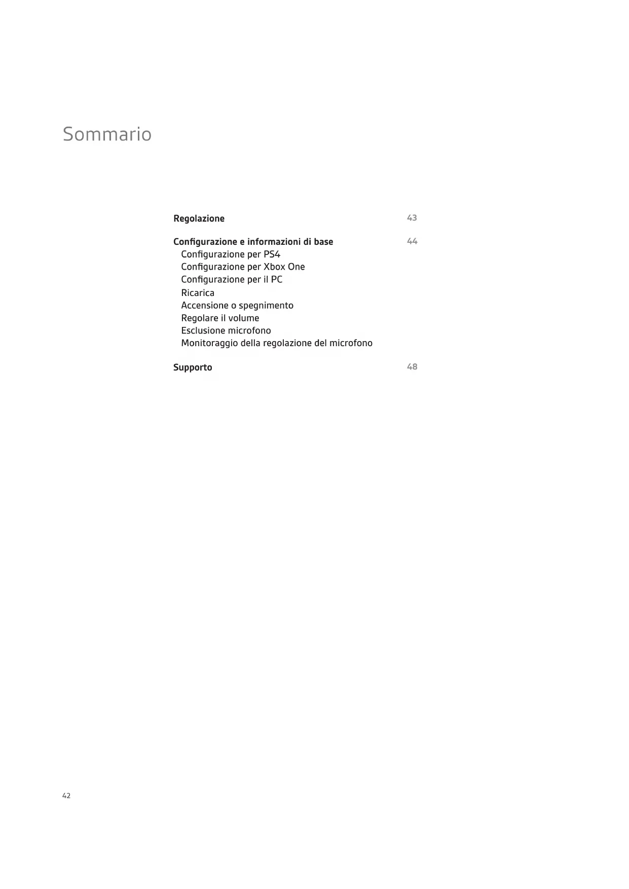 Supporto43 Regolazione I componenti della cuffia si adattano facilmente alla struttura per configurare al meglio acustica e vestibilità. L’archetto si regola su tre dimensioni (piccola, media, grande) spostando i cuscinetti. Per rimuovere un cuscinetto, premere su di esso in modo da staccarlo dall’archetto. NOTA Lo stile della fascia può variare.44 PS4 PS4 (versione Slim) Collegare l’adattatore al sistema. Collegare l’adattatore al sistema. NOTA Assicurarsi che l’interruttore sul retro dell’adattatore sia impostato sull’opzione desiderata: Console o PC. Collegare l’adattatore al sistema. Accendere la console PS4 e controllare la presenza di aggiornamenti Accendere la console PS4 e controllare la presenza di aggiornamenti Per regolare le impostazioni del sistema audio, consultare la Guida dell’utente della console. Per regolare le impostazioni del sistema audio, consultare la Guida dell’utente della console. Configurazione per PS4 Configurazione per Xbox One