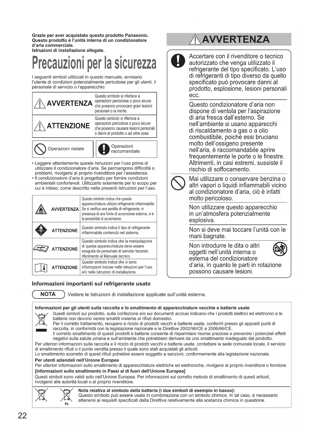 00_330596_all.indb 21 2021/4/14 13:07:0322 Grazie per aver acquistato questo prodotto Panasonic.Questo prodotto è l’unità interna di un condizionatore d’aria commerciale.Istruzioni di installazione allegate. Precauzioni per la sicurezza I seguenti simboli utilizzati in questo manuale, avvisano l’utente di condizioni potenzialmente pericolose per gli utenti, il personale di servizio o l’apparecchio: AVVERTENZA Questo simbolo si riferisce a operazioni pericolose o poco sicure che possono provocare gravi lesioni personali o la morte. ATTENZIONE Questo simbolo si riferisce a operazioni pericolose o poco sicure che possono causare lesioni personali o danni al prodotto o ad altre cose.Operazioni vietateOperazioni raccomandate• Leggere attentamente queste Istruzioni per l’uso prima di utilizzare il condizionatore d’aria. Se permangono difcoltà o problemi, rivolgersi al proprio rivenditore per l’assistenza.• Il condizionatore d’aria è progettato per fornire condizioni ambientali confortevoli. Utilizzarlo solamente per lo scopo per cui è inteso, come descritto nelle presenti Istruzioni per l’uso. Accertare con il rivenditore o tecnico autorizzato che venga utilizzato il refrigerante del tipo specicato. L’uso di refrigeranti di tipo diverso da quello specicato può provocare danni al prodotto, esplosione, lesioni personali ecc. Questo condizionatore d’aria non dispone di ventola per l’aspirazione di aria fresca dall’esterno. Se nell’ambiente si usano apparecchi di riscaldamento a gas o a olio combustibile, poiché essi bruciano molto dell’ossigeno presente nell’aria, è raccomandabile aprire frequentemente le porte o le nestre. Altrimenti, in casi estremi, sussiste il rischio di soffocamento. Mai utilizzare o conservare benzina o altri vapori o liquidi inammabili vicino al condizionatore d’aria, ciò è infatti molto pericoloso. Non utilizzare questo apparecchio in un’atmosfera potenzialmente esplosiva. Non si deve mai toccare l’unità con le mani bagnate. Non introdurre le dita o altri oggetti nell’unità interna o esterna del condizionatore d’aria, in quanto le parti in rotazione possono causare lesioni. AVVERTENZA AVVERTENZAQuesto simbolo indica che questa apparecchiatura utilizza refrigerante infiammabile. Se si verifica una perdita di refrigerante, in presenza di una fonte di accensione esterna, vi è la possibilità di accensione.ATTENZIONEQuesto simbolo indica il tipo di refrigerante infiammabile contenuto nel sistema.ATTENZIONEQuesto simbolo indica che la manipolazione di questa apparecchiatura deve essere eseguita da personale di servizio facendo riferimento al Manuale tecnico.ATTENZIONEQuesto simbolo indica che vi sono informazioni incluse nelle Istruzioni per l’uso e/o nelle Istruzioni di installazione.Informazioni importanti sul refrigerante usato NOTA Vedere le Istruzioni di installazione applicate sull’unità esterna.Informazioni per gli utenti sulla raccolta e lo smaltimento di apparecchiature vecchie e batterie usate
