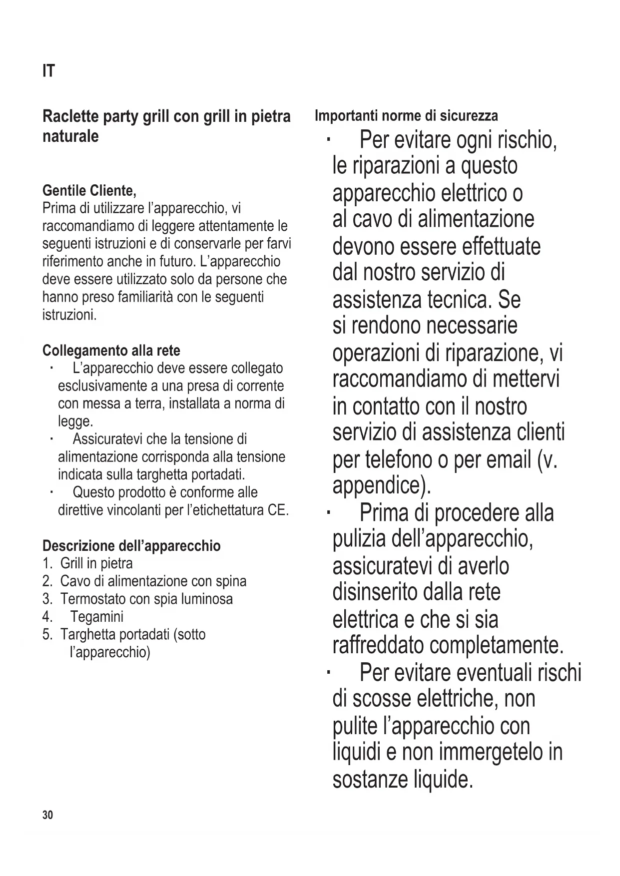 Funzionalità Questo apparecchio è un grill elettrico per raclette, adatto per grigliare carni magre, pesci e ortaggi e per preparare formaggi “au gratin”. Ogni altro utilizzo diverso da quello descritto in questo manuale è da considerarsi improprio e può portare a lesioni personali o a danni materiali. Primo utilizzo ∙ Eliminate completamente tutto il materiale di imballaggio. ∙ Prima di mettere in uso il grill per la prima volta, pulite il grill in pietra e i tegamini con un panno umido. ∙ Fate preriscaldare l’apparecchio con la pietra e i tegamini per circa 10 minuti senza aggiungere alimenti: questo accorgimento servirà ad eliminare il cattivo odore tipico emesso da un grill alla sua prima messa in funzione. È possibile che si diffonda un po’ di fumo. È bene quindi assicurare una buona aerazione lasciando aperte porte e nestre. ∙ In seguito pulite l’apparecchio seguendo le istruzioni indicate nella sezione Manutenzione e pulizia. Grill in pietra ∙ Prima dell’uso, inserite sull’apparecchio la pietra con il lato liscio rivolto verso l’alto. ∙ Avvertenza: Evitate di mettere la pietra fredda sull’elemento riscaldante già caldo. ∙ La pietra può essere usata per preparare ortaggi, fettine di carne, letti di pesce e altro. ∙ La pietra è un materiale assolutamente naturale. È possibile che presenti piccole incrinature causate dalla normale espansione e contrazione del materiale durante le fasi di riscaldamento e di raffreddamento o che acquisti una colorazione più scura: ciò è del tutto normale e non comporta nessun effetto dannoso. ∙ Non mettete mai sulla pietra alimenti congelati o che contengono aceto (p. es. cetriolini sottaceto o senape). Termostato variabile e spia luminosa ∙ Il termostato serve a regolare la temperatura tra il valore di MIN e quello di MAX. ∙ La spia luminosa mostra la fase di riscaldamento corrente: Riscaldamento attivato = spia luminosa accesa Riscaldamento disattivato = spia luminosa spenta ∙ Dopo l’uso, riportate il termostato sull’impostazione più bassa e scollegate l’apparecchio dall’alimentazione elettrica.34 104 x 142 mm Funzionamento Consiglio: Per apprezzare al massimo una grigliata, consigliamo di togliere la carne dal frigorifero circa 30 minuti prima di grigliare e di lasciarla riposare in un piatto coperto. ∙ Sistemate la pietra di grigliatura sull’apparecchio. ∙ Collegate la spina a una presa di corrente elettrica adatta e ruotate il termostato tutto verso destra. ∙ Lasciate che l’apparecchio si riscaldi 10 minuti circa perché raggiunga la temperatura necessaria. Ma l’utilizzo del grill in pietra, richiede un tempo di pre-riscaldamento di circa 25 minuti. ∙ Sistemate gli alimenti sulla pietra. ∙ Sistemate il formaggio raclette nei tegamini. Mettete i tegamini nell’apparecchio, sotto l’elemento riscaldante e lasciateli no a quando il formaggio si è sciolto. ∙ Avvertenza: Non mettete i tegamini vuoti nell’apparecchio acceso. ∙ Dopo l’uso, ruotate il termostato tutto verso sinistra e scollegate l’apparecchio dall’alimentazione elettrica. Preparazione del formaggio raclette Calcolate 200-300 grammi di formaggio a persona. Tagliate il formaggio in fette da 3-5 millimetri di spessore e sistemate le fette sui tegamini. Vi consigliamo di utilizzare il formaggio raclette originale, anche se può essere utilizzato qualsiasi altro formaggio che fonde facilmente. Consigli pratici ∙ Fate scongelare perfettamente gli alimenti congelati prima di cucinarli. ∙ Evitate di danneggiare il rivestimento antiaderente dei tegamini utilizzando utensili antigrafo. ∙ Se desiderate preparare una grande quantità di cibo, ricordatevi che ogni tanto dovrete rimuovere con attenzione il grasso accumulato; utilizzate un panno da cucina adatto o altro materiale simile. Manutenzione e pulizia ∙ Prima di pulire l’apparecchio, assicuratevi che il cavo di alimentazione sia disinserito dalla presa di corrente e che l’apparecchio si sia raffreddato completamente. ∙ Per evitare eventuali rischi di scosse elettriche, non pulite l’apparecchio con liquidi e non immergetelo in sostanze liquide. ∙ Non usate soluzioni abrasive o detersivi concentrati. ∙ Pulite le parti esterne dell’apparecchio con un panno umido pulito. ∙ Togliete i tegamini dopo che si sono raffreddati e lavateli con un po’ di acqua calda. Se necessario, potete utilizzare un detersivo delicato. Asciugate accuratamente con un panno morbido. ∙ Prima di togliere la pietra per pulirla, assicuratevi che si sia raffreddata completamente. Pulite la pietra sotto acqua corrente con una spugna sintetica e senza nessun tipo di detersivo. Asciugate accuratamente con un panno morbido. Non immergete la pietra in acqua.104 x 142 mm