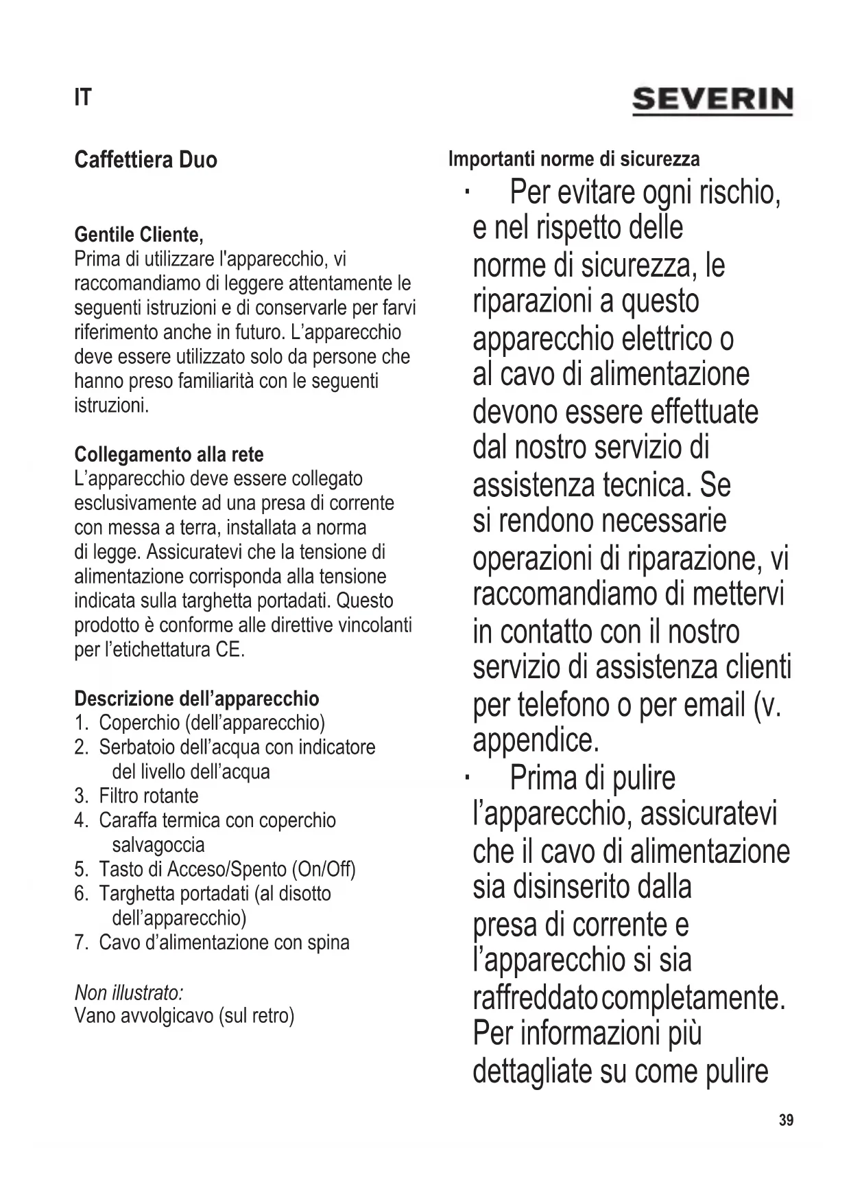 Caffettiera Duo Gentile Cliente, Prima di utilizzare l'apparecchio, vi raccomandiamo di leggere attentamente le seguenti istruzioni e di conservarle per farvi riferimento anche in futuro. L’apparecchio deve essere utilizzato solo da persone che hanno preso familiarità con le seguenti istruzioni. Collegamento alla rete L’apparecchio deve essere collegato esclusivamente ad una presa di corrente con messa a terra, installata a norma di legge. Assicuratevi che la tensione di alimentazione corrisponda alla tensione indicata sulla targhetta portadati. Questo prodotto è conforme alle direttive vincolanti per l’etichettatura CE. Descrizione dell’apparecchio