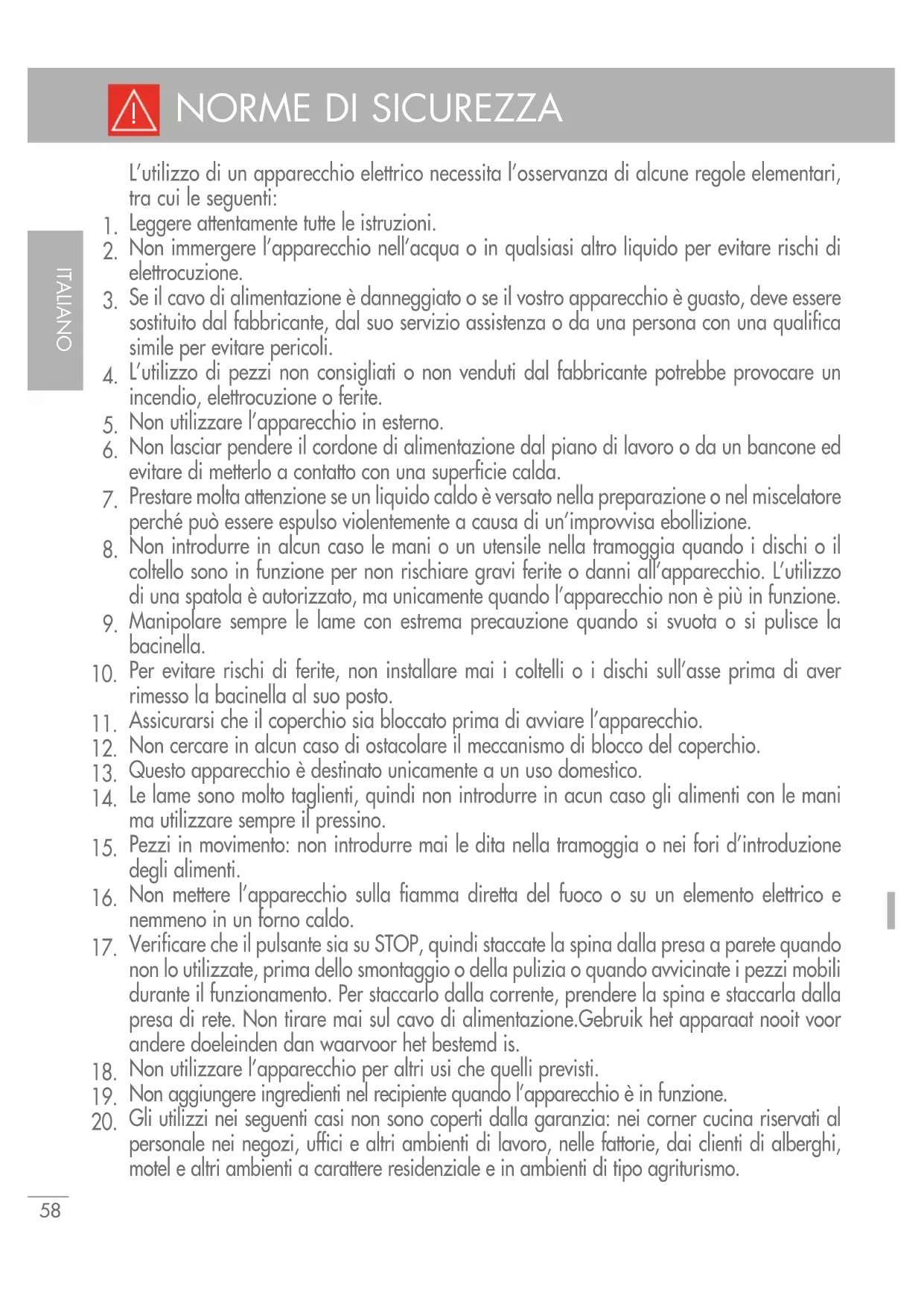 L’utilizzo di un apparecchio elettrico necessita l’osservanza di alcune regole elementari, tra cui le seguenti: Leggere attentamente tutte le istruzioni. Non immergere l’apparecchio nell’acqua o in qualsiasi altro liquido per evitare rischi di elettrocuzione. Se il cavo di alimentazione è danneggiato o se il vostro apparecchio è guasto, deve essere sostituito dal fabbricante, dal suo servizio assistenza o da una persona con una qualifica simile per evitare pericoli. L’utilizzo di pezzi non consigliati o non venduti dal fabbricante potrebbe provocare un incendio, elettrocuzione o ferite. Non utilizzare l’apparecchio in esterno. Non lasciar pendere il cordone di alimentazione dal piano di lavoro o da un bancone ed evitare di metterlo a contatto con una superficie calda. Prestare molta attenzione se un liquido caldo è versato nella preparazione o nel miscelatore perché può essere espulso violentemente a causa di un’improvvisa ebollizione. Non introdurre in alcun caso le mani o un utensile nella tramoggia quando i dischi o il coltello sono in funzione per non rischiare gravi ferite o danni all’apparecchio. L’utilizzo di una spatola è autorizzato, ma unicamente quando l’apparecchio non è più in funzione. Manipolare sempre le lame con estrema precauzione quando si svuota o si pulisce la bacinella. Per evitare rischi di ferite, non installare mai i coltelli o i dischi sull’asse prima di aver rimesso la bacinella al suo posto. Assicurarsi che il coperchio sia bloccato prima di avviare l’apparecchio. Non cercare in alcun caso di ostacolare il meccanismo di blocco del coperchio. Questo apparecchio è destinato unicamente a un uso domestico. Le lame sono molto taglienti, quindi non introdurre in acun caso gli alimenti con le mani ma utilizzare sempre il pressino. Pezzi in movimento: non introdurre mai le dita nella tramoggia o nei fori d’introduzione degli alimenti. Non mettere l’apparecchio sulla fiamma diretta del fuoco o su un elemento elettrico e nemmeno in un forno caldo. Verificare che il pulsante sia su STOP, quindi staccate la spina dalla presa a parete quando non lo utilizzate, prima dello smontaggio o della pulizia o quando avvicinate i pezzi mobili durante il funzionamento. Per staccarlo dalla corrente, prendere la spina e staccarla dalla presa di rete. Non tirare mai sul cavo di alimentazione.Gebruik het apparaat nooit voor andere doeleinden dan waarvoor het bestemd is. Non utilizzare l’apparecchio per altri usi che quelli previsti. Non aggiungere ingredienti nel recipiente quando l’apparecchio è in funzione. Gli utilizzi nei seguenti casi non sono coperti dalla garanzia: nei corner cucina riservati al personale nei negozi, uffici e altri ambienti di lavoro, nelle fattorie, dai clienti di alberghi, motel e altri ambienti a carattere residenziale e in ambienti di tipo agriturismo.
