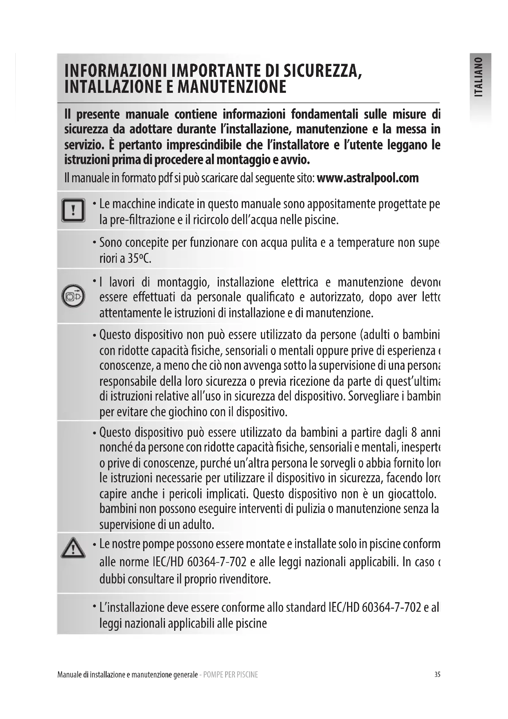 Il presente manuale contiene informazioni fondamentali sulle misure di sicurezza da adottare durante l’installazione, manutenzione e la messa in servizio. È pertanto imprescindibile che l’installatore e l’utente leggano le istruzioni prima di procedere al montaggio e avvio. Il manuale in formato pdf si può scaricare dal seguente sito: www.astralpool.com
