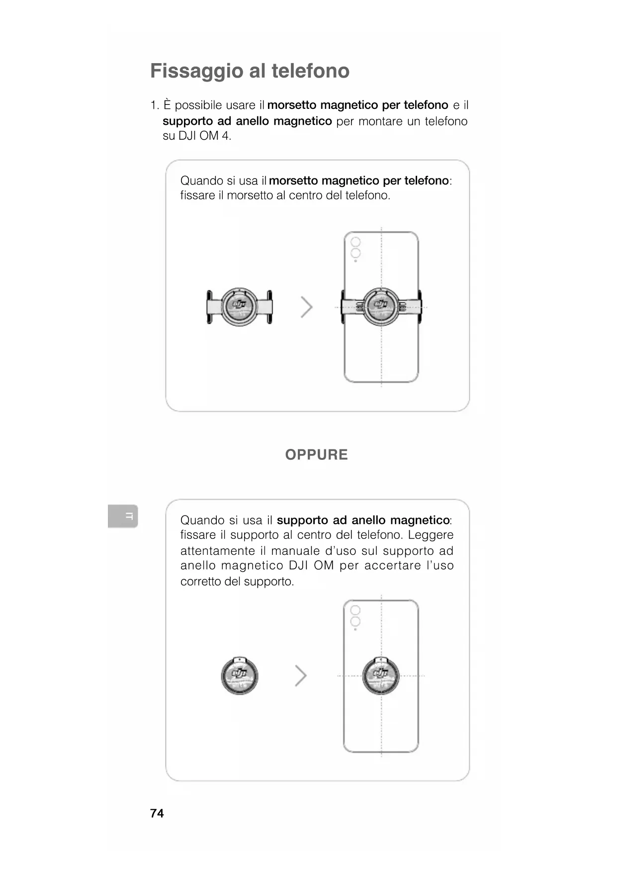 fissare il supporto al centro del telefono. Leggere attentamente il manuale d’uso sul supporto ad anello magnetico DJI OM per accertare l’uso corretto del supporto. OPPURE75