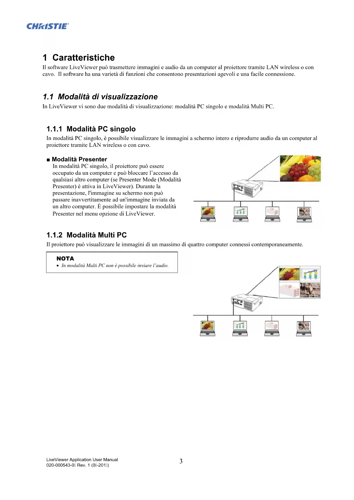 LiveViewer Application User Manual 020-000543-0 Rev. 1 (0-201)3 1 Caratteristiche Il software LiveViewer può trasmettere immagini e audio da un computer al proiettore tramite LAN wireless o con cavo. Il software ha una varietà di funzioni che consentono presentazioni agevoli e una facile connessione.