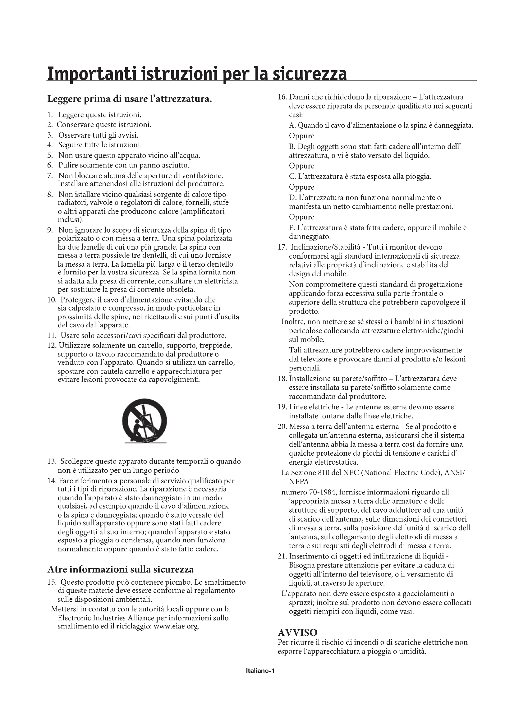 SI INSTALLA ED USA IL MONITOR, PER OTTENERE LE PRESTAZIONI OTTIMALI: Il pannello dello schermo al plasma è fatto di elementi delicati (celle), 99,99 percento dei quali sono celle attive. Alcune celle potrebbero non produrre luce oppure restare sempre accese. Per un uso in sicurezza, e per evitare di danneggiare l’unità, leggere ed osservare attentamente le istruzioni che seguono. NON APRIRE IL MONITOR. All’interno non ci sono parti riparabili e l’apertura o la rimozione delle coperture provoca l’esposizione a pericoli di scosse elettriche ed altri rischi. Il produttore non è responsabile per nessuna lesione personale o danni provocati dal tentativo, da parte di persone non qualicate, di aprire la copertura posteriore e di eseguire riparazioni. Fare riferimento a personale di servizio qualicato per tutti i tipi di riparazione. Non versare alcun liquido sul mobile e non usare il monitor in vicinanza dell’acqua. Non inserire oggetti di alcun tipo nelle fessure del mobile, perché possono toccare punti d’alta tensione che possono essere dannosi o fatali e provocare scosse elettriche, incendi e guasti dell’attrezzatura. Non piegare, comprimere o altrimenti danneggiare il cavo d’alimentazione. Non collocare oggetti pesanti sul cavo d’alimentazione. I danni al cavo d’alimentazione possono provocare scosse o incendi. Non collocare questo prodotto su carrelli, basi o tavolo inclinati o instabili, perché il monitor potrebbe cadere provocando gravi danni. Non usare su veicoli mobili perché l’unità potrebbe cadere o capovolgersi e provocare lesioni. Il cavo d’alimentazione è il mezzo principale per scollegare il sistema dall’alimentazione elettrica. Il monitor deve essere installato vicino alla presa di corrente che deve essere facilmente accessibile. Questa attrezzatura deve essere collegata and una presa di corrente elettrica con un collegamento di messa a terra. Non collocare alcun oggetto sul monitor e non usare il monitor all’esterno. Non usare la spina polarizzata dell’unità con prolunghe o altre prese di corrente che non consentono il completo inserimento della spina. Il cavo d’alimentazione usato deve essere approvato e soddisfare i requisiti degli standard di sicurezza del proprio paese. (In Europa deve essere usato il tipo H05VV-F 3G 1mm