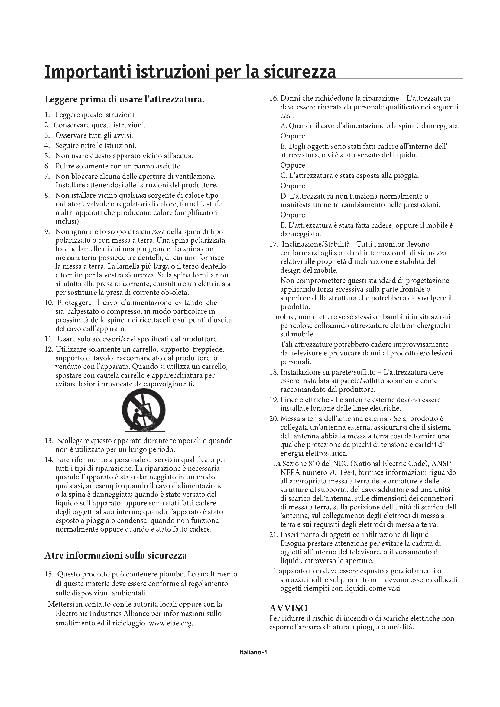 SI INSTALLA ED USA IL MONITOR, PER OTTENERE LE PRESTAZIONI OTTIMALI: Il pannello dello schermo al plasma è fatto di elementi delicati (celle), 99,99 percento dei quali sono celle attive. Alcune celle potrebbero non produrre luce oppure restare sempre accese. Per un uso in sicurezza, e per evitare di danneggiare l’unità, leggere ed osservare attentamente le istruzioni che seguono. NON APRIRE IL MONITOR. All’interno non ci sono parti riparabili e l’apertura o la rimozione delle coperture provoca l’esposizione a pericoli di scosse elettriche ed altri rischi. Il produttore non è responsabile per nessuna lesione personale o danni provocati dal tentativo, da parte di persone non qualicate, di aprire la copertura posteriore e di eseguire riparazioni. Fare riferimento a personale di servizio qualicato per tutti i tipi di riparazione. Non versare alcun liquido sul mobile e non usare il monitor in vicinanza dell’acqua. Non inserire oggetti di alcun tipo nelle fessure del mobile, perché possono toccare punti d’alta tensione che possono essere dannosi o fatali e provocare scosse elettriche, incendi e guasti dell’attrezzatura. Non piegare, comprimere o altrimenti danneggiare il cavo d’alimentazione. Non collocare oggetti pesanti sul cavo d’alimentazione. I danni al cavo d’alimentazione possono provocare scosse o incendi. Non collocare questo prodotto su carrelli, basi o tavolo inclinati o instabili, perché il monitor potrebbe cadere provocando gravi danni. Non usare su veicoli mobili perché l’unità potrebbe cadere o capovolgersi e provocare lesioni. Il cavo d’alimentazione è il mezzo principale per scollegare il sistema dall’alimentazione elettrica. Il monitor deve essere installato vicino alla presa di corrente che deve essere facilmente accessibile. Questa attrezzatura deve essere collegata and una presa di corrente elettrica con un collegamento di messa a terra. Non collocare alcun oggetto sul monitor e non usare il monitor all’esterno. Non usare la spina polarizzata dell’unità con prolunghe o altre prese di corrente che non consentono il completo inserimento della spina. Il cavo d’alimentazione usato deve essere approvato e soddisfare i requisiti degli standard di sicurezza del proprio paese. (In Europa deve essere usato il tipo H05VV-F 3G 1mm