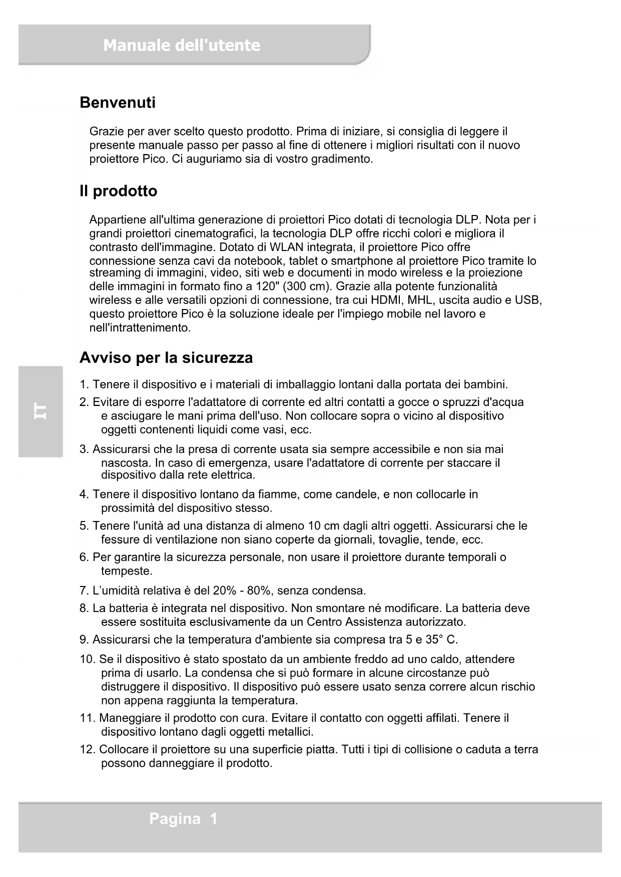 Benvenuti Grazie per aver scelto questo prodotto. Prima di iniziare, si consiglia di leggere il presente manuale passo per passo al fine di ottenere i migliori risultati con il nuovo proiettore Pico. Ci auguriamo sia di vostro gradimento. Il prodotto Appartiene all'ultima generazione di proiettori Pico dotati di tecnologia DLP. Nota per i grandi proiettori cinematografici, la tecnologia DLP offre ricchi colori e migliora il contrasto dell'immagine. Dotato di WLAN integrata, il proiettore Pico offre connessione senza cavi da notebook, tablet o smartphone al proiettore Pico tramite lo streaming di immagini, video, siti web e documenti in modo wireless e la proiezione delle immagini in formato fino a 120" (300 cm). Grazie alla potente funzionalità wireless e alle versatili opzioni di connessione, tra cui HDMI, MHL, uscita audio e USB, questo proiettore Pico è la soluzione ideale per l'impiego mobile nel lavoro e nell'intrattenimento. Avviso per la sicurezza