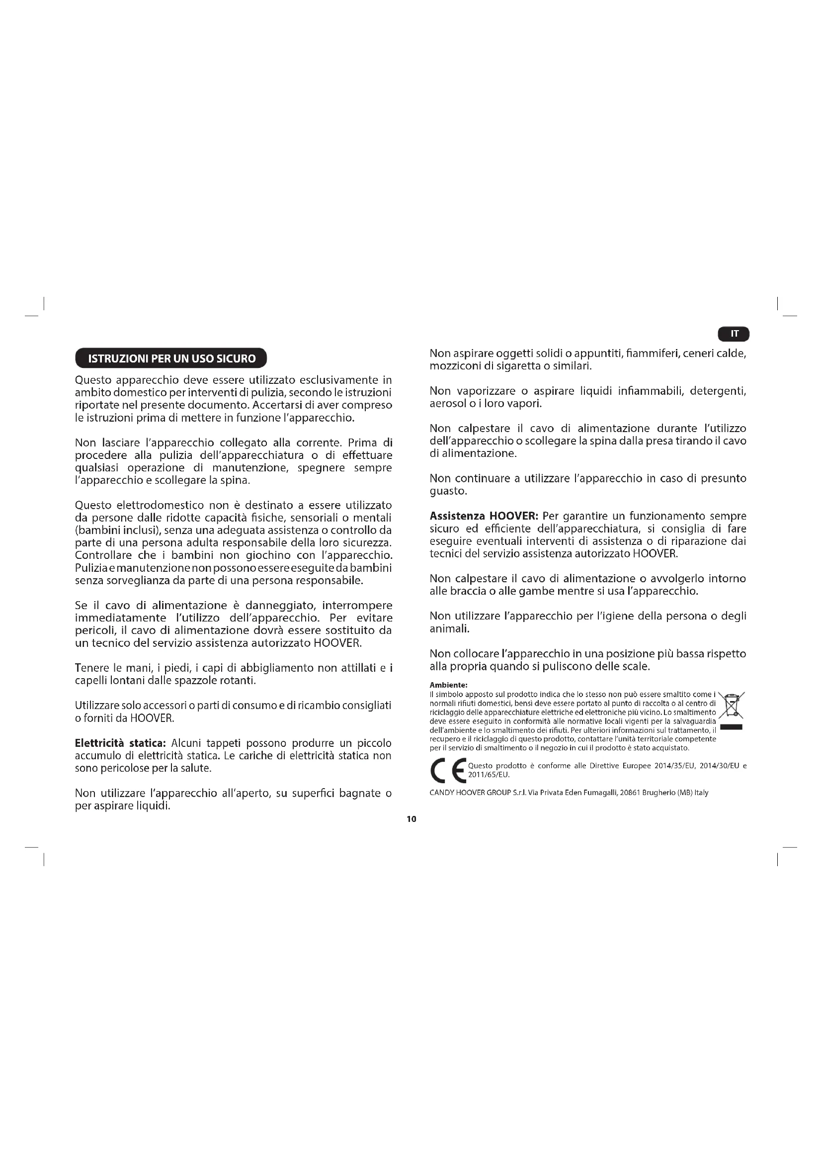 Questo apparecchio deve essere utilizzato esclusivamente in ambito domestico per interventi di pulizia, secondo le istruzioni riportate nel presente documento. Accertarsi di aver compreso le istruzioni prima di mettere in funzione l’apparecchio. Non lasciare l’apparecchio collegato alla corrente. Prima di procedere alla pulizia dell’apparecchiatura o di eettuare qualsiasi operazione di manutenzione, spegnere sempre l’apparecchio e scollegare la spina. Questo elettrodomestico non è destinato a essere utilizzato da persone dalle ridotte capacità siche, sensoriali o mentali (bambini inclusi), senza una adeguata assistenza o controllo da parte di una persona adulta responsabile della loro sicurezza. Controllare che i bambini non giochino con l’apparecchio. Pulizia e manutenzione non possono essere eseguite da bambini senza sorveglianza da parte di una persona responsabile. Se il cavo di alimentazione è danneggiato, interrompere immediatamente l’utilizzo dell’apparecchio. Per evitare pericoli, il cavo di alimentazione dovrà essere sostituito da un tecnico del servizio assistenza autorizzato HOOVER. Tenere le mani, i piedi, i capi di abbigliamento non attillati e i capelli lontani dalle spazzole rotanti. Utilizzare solo accessori o parti di consumo e di ricambio consigliati o forniti da HOOVER. Elettricità statica: Alcuni tappeti possono produrre un piccolo accumulo di elettricità statica. Le cariche di elettricità statica non sono pericolose per la salute. Non utilizzare l’apparecchio all’aperto, su superci bagnate o per aspirare liquidi. Non aspirare oggetti solidi o appuntiti, ammiferi, ceneri calde, mozziconi di sigaretta o similari. Non vaporizzare o aspirare liquidi inammabili, detergenti, aerosol o i loro vapori. Non calpestare il cavo di alimentazione durante l’utilizzo dell’apparecchio o scollegare la spina dalla presa tirando il cavo di alimentazione. Non continuare a utilizzare l’apparecchio in caso di presunto guasto. Assistenza HOOVER: Per garantire un funzionamento sempre sicuro ed eciente dell’apparecchiatura, si consiglia di fare eseguire eventuali interventi di assistenza o di riparazione dai tecnici del servizio assistenza autorizzato HOOVER. Non calpestare il cavo di alimentazione o avvolgerlo intorno alle braccia o alle gambe mentre si usa l’apparecchio. Non utilizzare l’apparecchio per l’igiene della persona o degli animali. Non collocare l’apparecchio in una posizione più bassa rispetto alla propria quando si puliscono delle scale. Ambiente: Il simbolo apposto sul prodotto indica che lo stesso non può essere smaltito come i normali riuti domestici, bensì deve essere portato al punto di raccolta o al centro di riciclaggio delle apparecchiature elettriche ed elettroniche più vicino. Lo smaltimento deve essere eseguito in conformità alle normative locali vigenti per la salvaguardia dell’ambiente e lo smaltimento dei riuti. Per ulteriori informazioni sul trattamento, il recupero e il riciclaggio di questo prodotto, contattare l’unità territoriale competente per il servizio di smaltimento o il negozio in cui il prodotto è stato acquistato. Questo prodotto è conforme alle Direttive Europee 2014/35/EU, 2014/30/EU e 2011/65/EU. CANDY HOOVER GROUP S.r.l. Via Privata Eden Fumagalli, 20861 Brugherio (MB) Italy11 DESCRIZIONE DELL’APPARECCHIO: A. Regolatore forza aspirante B. Impugnatura tubo C. Tubo telescopico D. Pulsante a pedale Accensione/ Spegnimento E. Coperchio del ltro in uscita F. Spazzola tappeti e pavimenti (GP)** F1. Spazzola per tappeti (CA)** F2. Spazzola per pavimenti duri (HF)** G. Selettore tipo pavimento H. Alloggiamento tubo in posizione di parcheggio