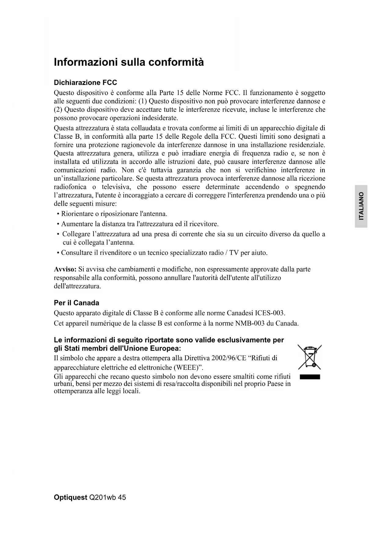 - Consultare il rivenditore o un tecnico specializzato radio / TV per aiuto. Avviso: Si avvisa che cambiamenti e modifiche, non espressamente approvate dalla parte responsabile alla conformità, possono annullare l'autorità dell'utente all'utilizzo dell'attrezzatura. Per il Canada Questo apparato digitale di Classe B è conforme alle norme Canadesi ICES-003. Cet appareil numérique de la classe B est conforme à la norme NMB-003 du Canada. Le informazioni di seguito riportate sono valide esclusivamente per gli Stati membri dell'Unione Europea: Il simbolo che appare a destra ottempera alla Direttiva 2002/96/CE “Rifiuti di apparecchiature elettriche ed elettroniche (WEEE)”. Gli apparecchi che recano questo simbolo non devono essere smaltiti come rifiuti urbani, bensì per mezzo dei sistemi di resa/raccolta disponibili nel proprio Paese in ottemperanza alle leggi locali.46 Optiquest Q201wb ITALIANO Istruzioni importanti sulla sicurezza