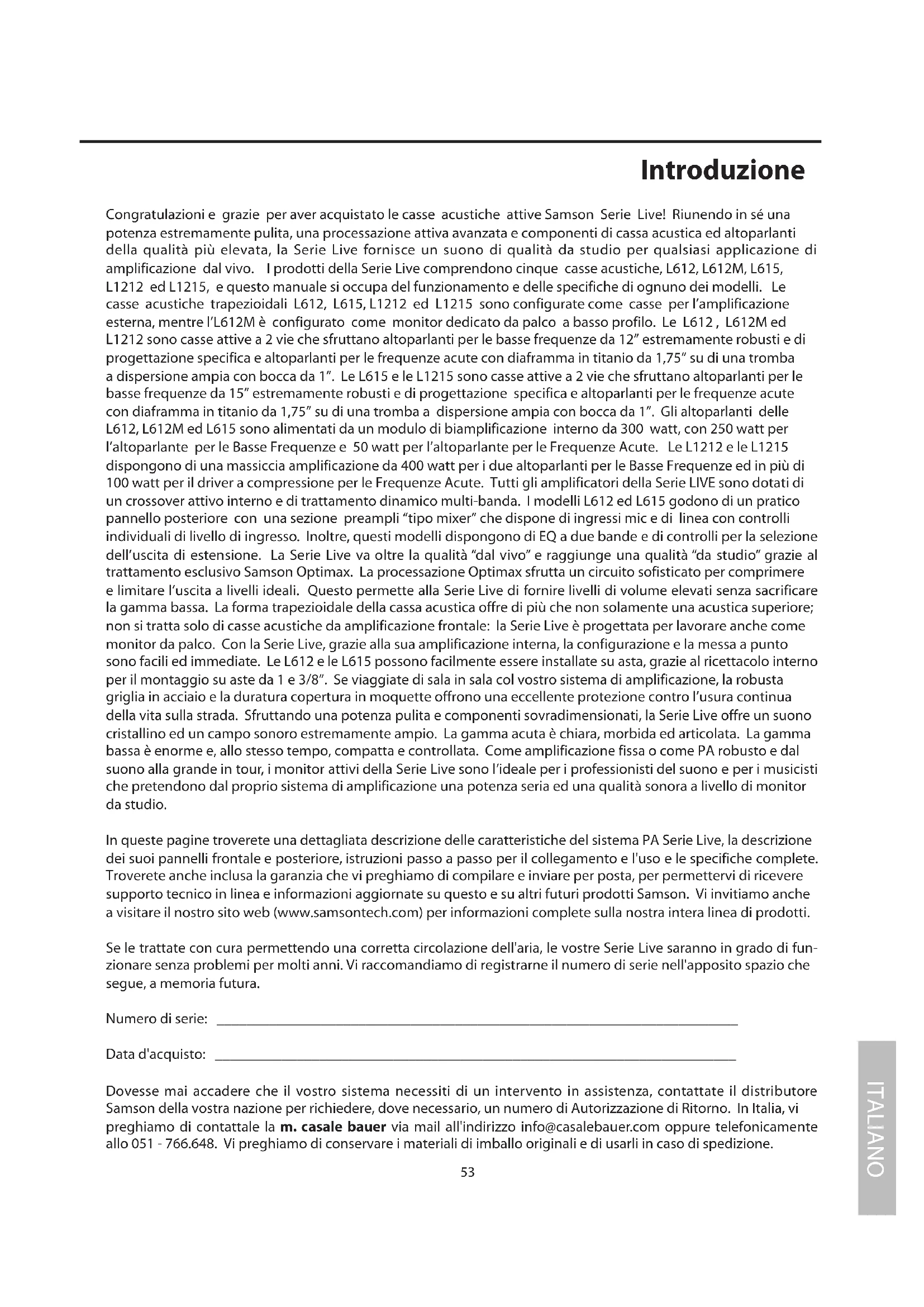 Congratulazioni e grazie per aver acquistato le casse acustiche attive Samson Serie Live! Riunendo in sé una potenza estremamente pulita, una processazione attiva avanzata e componenti di cassa acustica ed altoparlanti della qualità più elevata, la Serie Live fornisce un suono di qualità da studio per qualsiasi applicazione di amplificazione dal vivo. I prodotti della Serie Live comprendono cinque casse acustiche, L612, L612M, L615, L1212 ed L1215, e questo manuale si occupa del funzionamento e delle specifiche di ognuno dei modelli. Le casse acustiche trapezioidali L612, L615, L1212 ed L1215 sono configurate come casse per l’amplificazione esterna, mentre l’L612M è configurato come monitor dedicato da palco a basso profilo. Le L612 , L612M ed L1212 sono casse attive a 2 vie che sfruttano altoparlanti per le basse frequenze da 12” estremamente robusti e di progettazione specifica e altoparlanti per le frequenze acute con diaframma in titanio da 1,75” su di una tromba a dispersione ampia con bocca da 1”. Le L615 e le L1215 sono casse attive a 2 vie che sfruttano altoparlanti per le basse frequenze da 15” estremamente robusti e di progettazione specifica e altoparlanti per le frequenze acute con diaframma in titanio da 1,75” su di una tromba a dispersione ampia con bocca da 1”. Gli altoparlanti delle L612, L612M ed L615 sono alimentati da un modulo di biamplificazione interno da 300 watt, con 250 watt per l’altoparlante per le Basse Frequenze e 50 watt per l’altoparlante per le Frequenze Acute. Le L1212 e le L1215 dispongono di una massiccia amplificazione da 400 watt per i due altoparlanti per le Basse Frequenze ed in più di 100 watt per il driver a compressione per le Frequenze Acute. Tutti gli amplificatori della Serie LIVE sono dotati di un crossover attivo interno e di trattamento dinamico multi-banda. I modelli L612 ed L615 godono di un pratico pannello posteriore con una sezione preampli “tipo mixer” che dispone di ingressi mic e di linea con controlli individuali di livello di ingresso. Inoltre, questi modelli dispongono di EQ a due bande e di controlli per la selezione dell’uscita di estensione. La Serie Live va oltre la qualità “dal vivo” e raggiunge una qualità “da studio” grazie al trattamento esclusivo Samson Optimax. La processazione Optimax sfrutta un circuito sofisticato per comprimere e limitare l’uscita a livelli ideali. Questo permette alla Serie Live di fornire livelli di volume elevati senza sacrificare la gamma bassa. La forma trapezioidale della cassa acustica offre di più che non solamente una acustica superiore; non si tratta solo di casse acustiche da amplificazione frontale: la Serie Live è progettata per lavorare anche come monitor da palco. Con la Serie Live, grazie alla sua amplificazione interna, la configurazione e la messa a punto sono facili ed immediate. Le L612 e le L615 possono facilmente essere installate su asta, grazie al ricettacolo interno per il montaggio su aste da 1 e 3/8”. Se viaggiate di sala in sala col vostro sistema di amplificazione, la robusta griglia in acciaio e la duratura copertura in moquette offrono una eccellente protezione contro l’usura continua della vita sulla strada. Sfruttando una potenza pulita e componenti sovradimensionati, la Serie Live offre un suono cristallino ed un campo sonoro estremamente ampio. La gamma acuta è chiara, morbida ed articolata. La gamma bassa è enorme e, allo stesso tempo, compatta e controllata. Come amplificazione fissa o come PA robusto e dal suono alla grande in tour, i monitor attivi della Serie Live sono l’ideale per i professionisti del suono e per i musicisti che pretendono dal proprio sistema di amplificazione una potenza seria ed una qualità sonora a livello di monitor da studio. In queste pagine troverete una dettagliata descrizione delle caratteristiche del sistema PA Serie Live, la descrizione dei suoi pannelli frontale e posteriore, istruzioni passo a passo per il collegamento e l'uso e le specifiche complete. Troverete anche inclusa la garanzia che vi preghiamo di compilare e inviare per posta, per permettervi di ricevere supporto tecnico in linea e informazioni aggiornate su questo e su altri futuri prodotti Samson. Vi invitiamo anche a visitare il nostro sito web (www.samsontech.com) per informazioni complete sulla nostra intera linea di prodotti. Se le trattate con cura permettendo una corretta circolazione dell'aria, le vostre Serie Live saranno in grado di fun- zionare senza problemi per molti anni. Vi raccomandiamo di registrarne il numero di serie nell'apposito spazio che segue, a memoria futura. Numero di serie: ______________________________________________________________________ Data d'acquisto: ______________________________________________________________________ Dovesse mai accadere che il vostro sistema necessiti di un intervento in assistenza, contattate il distributore Samson della vostra nazione per richiedere, dove necessario, un numero di Autorizzazione di Ritorno. In Italia, vi preghiamo di contattale la m. casale bauer via mail all'indirizzo info@casalebauer.com oppure telefonicamente allo 051 - 766.648. Vi preghiamo di conservare i materiali di imballo originali e di usarli in caso di spedizione. IntroduzioneITALIANO