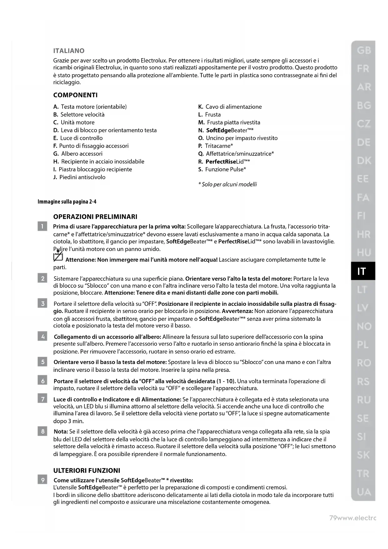 ITALIANO Grazie per aver scelto un prodotto Electrolux. Per ottenere i risultati migliori, usate sempre gli accessori e i ricambi originali Electrolux, in quanto sono stati realizzati appositamente per il vostro prodotto. Questo prodotto è stato progettato pensando alla protezione all’ambiente. Tutte le parti in plastica sono contrassegnate ai ni del riciclaggio. COMPONENTI A. Testa motore (orientabile) B. Selettore velocità C. Unità motore D. Leva di blocco per orientamento testa E. Luce di controllo F. Punto di ssaggio accessori G. Albero accessori H. Recipiente in acciaio inossidabile