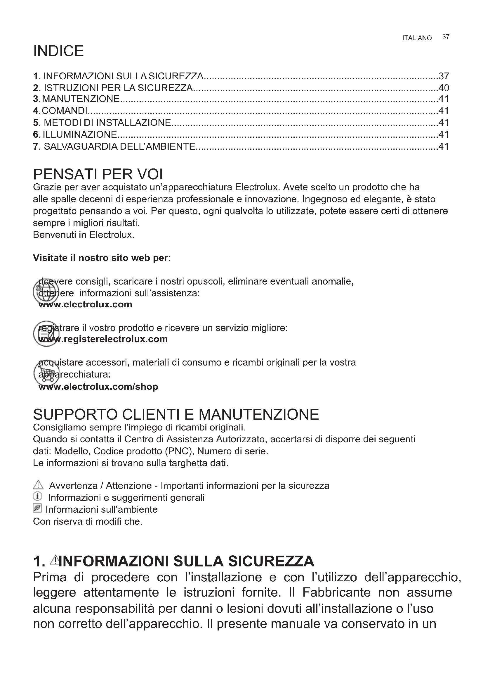 Prima di procedere con l’installazione e con l’utilizzo dell’apparecchio, leggere attentamente le istruzioni fornite. Il Fabbricante non assume alcuna responsabilità per danni o lesioni dovuti all’installazione o l’uso non corretto dell’apparecchio. Il presente manuale va conservato in un ITALIANO38 www.electrolux.com luogo sicuro e di facile accesso per futuro riferimento.
