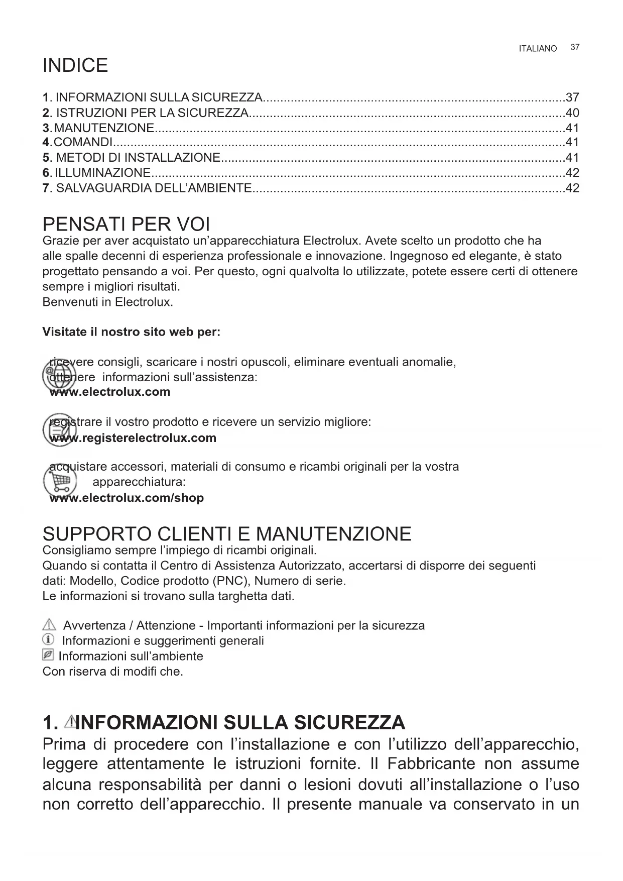 Prima di procedere con l’installazione e con l’utilizzo dell’apparecchio, leggere attentamente le istruzioni fornite. Il Fabbricante non assume alcuna responsabilità per danni o lesioni dovuti all’installazione o l’uso non corretto dell’apparecchio. Il presente manuale va conservato in un ITALIANO38 www.electrolux.com luogo sicuro e di facile accesso per futuro riferimento.